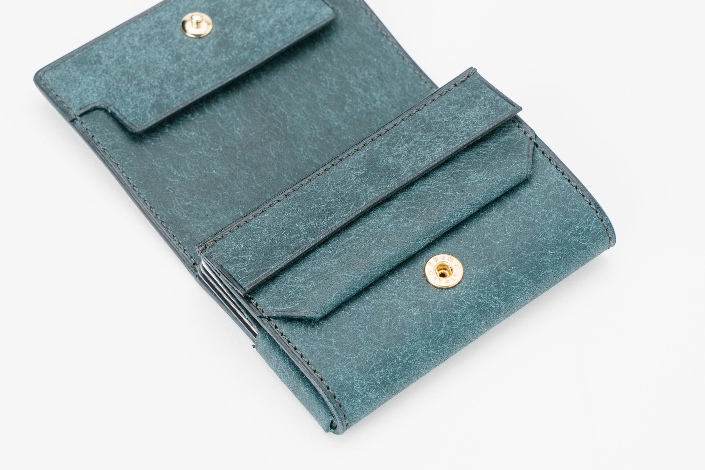 コインポケットが背面に付いている事が多い三つ折り財布ですが、それだと小銭を取り出す時に持ち替えなければならなりません。dritto 3 thinは構造を見直す事により持ち替える事無くコインを取り出す事が可能です。