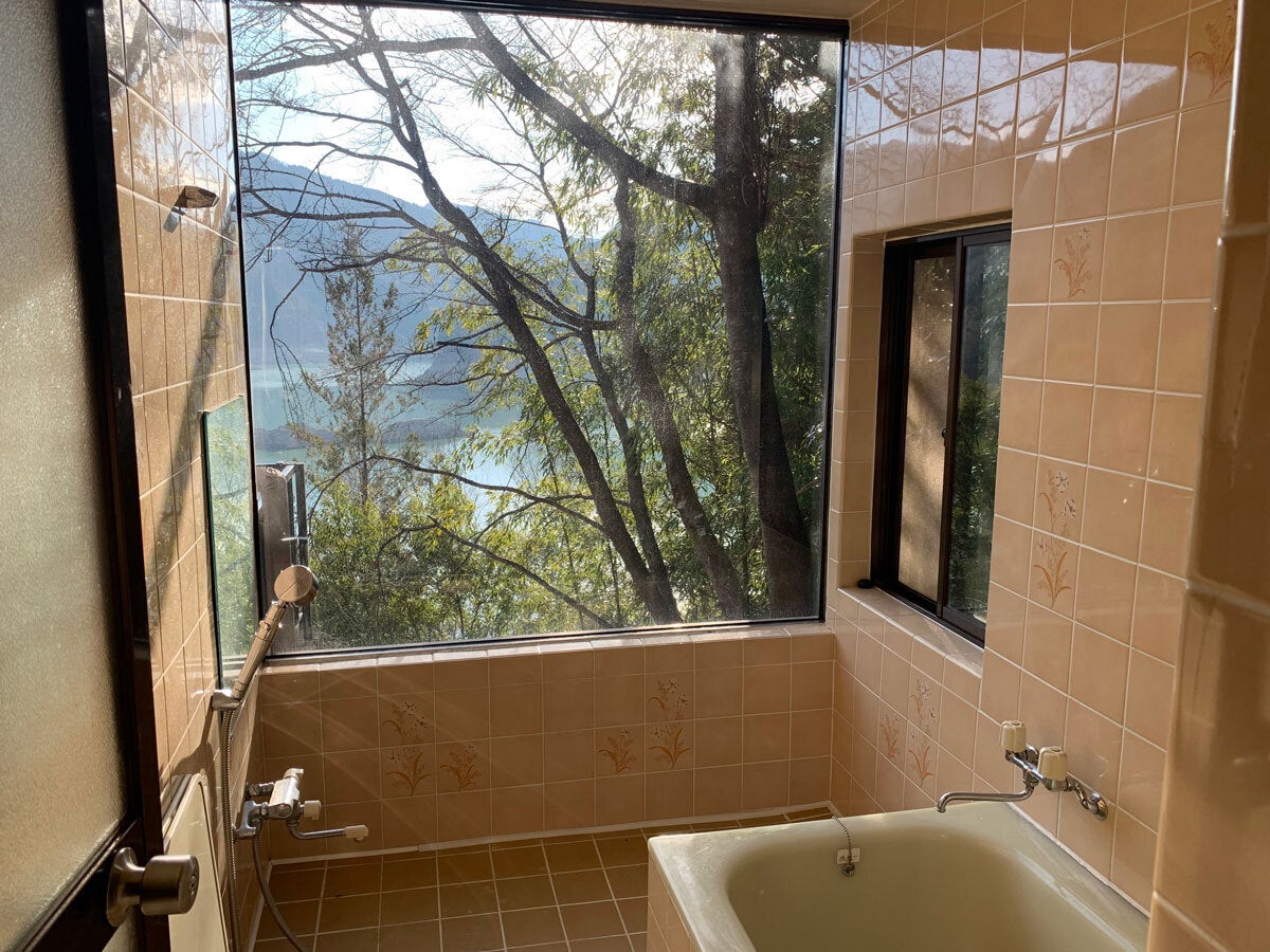 現在のお風呂。景色が最高ですが、古くさい雰囲気なので、最後の予算を投下し、