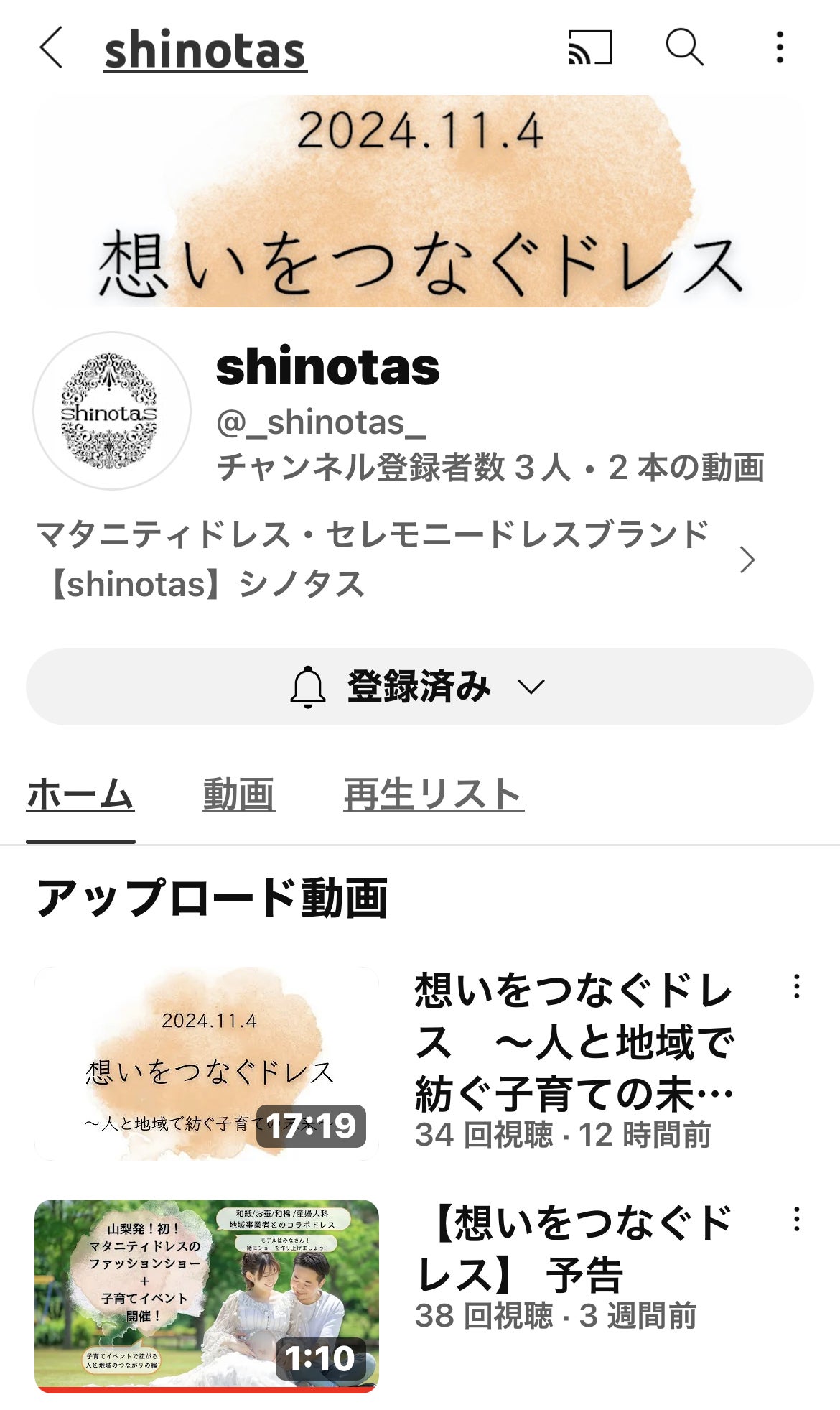 おはようございます〜!昨日、動画が公開されました!▷想いをつなぐドレス実行委員会委員長仁平のご挨拶やイベントについて▷コラボドレスの各コラボレーターさんたちのインタビューなどなどが載った動画となっています。ぜひ17分だけお時間をください〜!!!とりあえず1回目は流し聞きでも◎落ち着いたタイミングで大きい画面でもゆったりお楽しみください!チャンネル登録もぜひ〜!!------------------------------------想いをつなぐドレス〜人と地域で紡ぐ子育ての未来〜▷日時:2024年11月4日(月・祝)▷場所:はくばく文化ホール(山梨県南巨摩郡富士川町天神中條820-1)▷後援富士川町/富士川町教育委員会/梶山クリニック▷主催:想いをつなぐドレス実行委員会▷クラウドファンディング挑戦中!https://camp-fire.jp/projects/737588/view?utm_campaign=cp_po_share_c_msg_mypage_projects_show動画制作: studio yum.https://youtube.com/@studio-yum.?si=g8GknOD1D2HJ8FTm