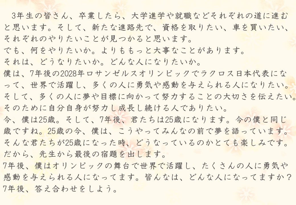 そして、卒業式の前日に、3年生での最後の学年集会があり、そこで各担任から卒業生に向けて話をする時間がありました。