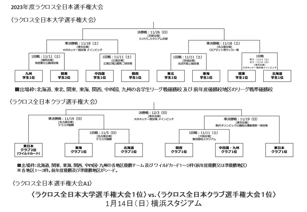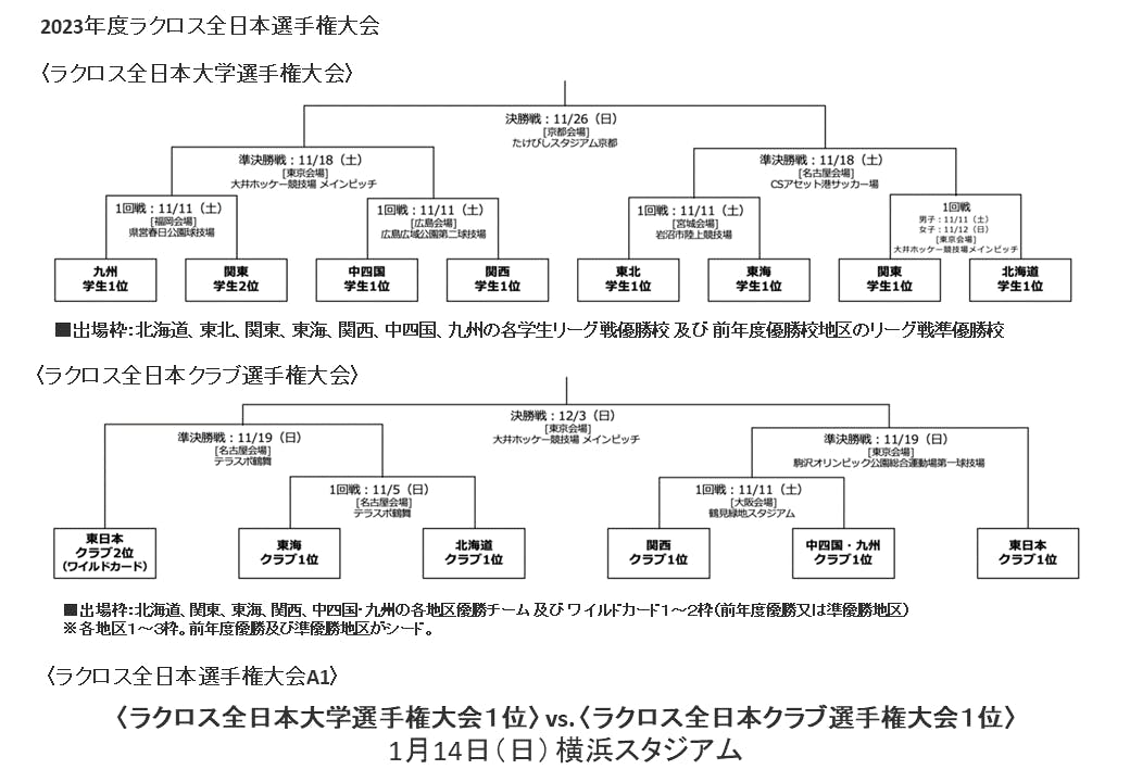 11月上旬から12月上旬にかけて各地区リーグ1位(前年度優勝又は準優勝地区は、上位2チーム)のチームで、トーナメント形式のラクロス全日本クラブ選手権(大学生は、ラクロス全日本大学選手権)が行われます。