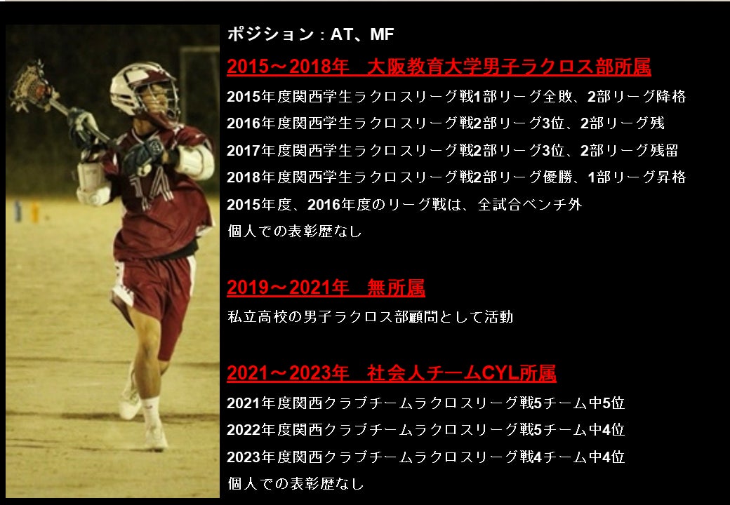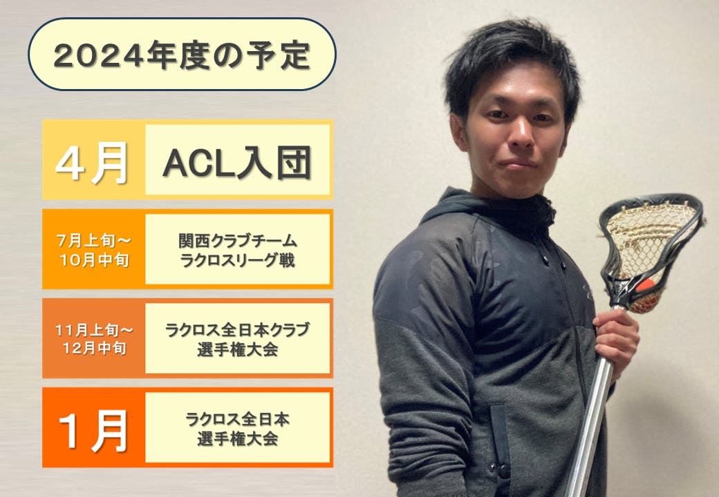 現在、僕は、どのチームにも所属していません。2024年2月に関西の社会人ラクロスリーグに所属している社会人チームCYLを退団し、2024年4月から入団予定のACL(関西の社会人ラクロスリーグ所属)への移籍の準備(必要資金の準備など)をしているところです。