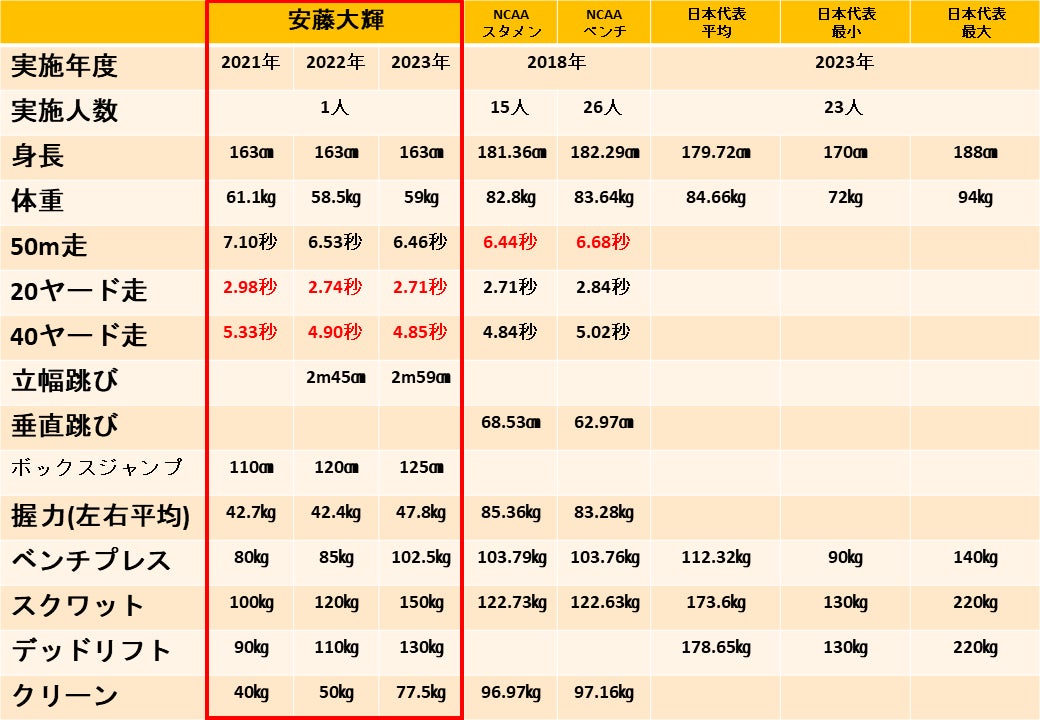 身長が低いので、圧倒的なスピードとキレを武器にする必要があると考えて、独学で身体のことを勉強したり、トレーニングを積み重ねることで、身体能力は向上し、50m走で言うと、2年間で7.10秒から6.46秒まで成長しました。(学生の頃も一度も6秒台で走れたことはありません。)