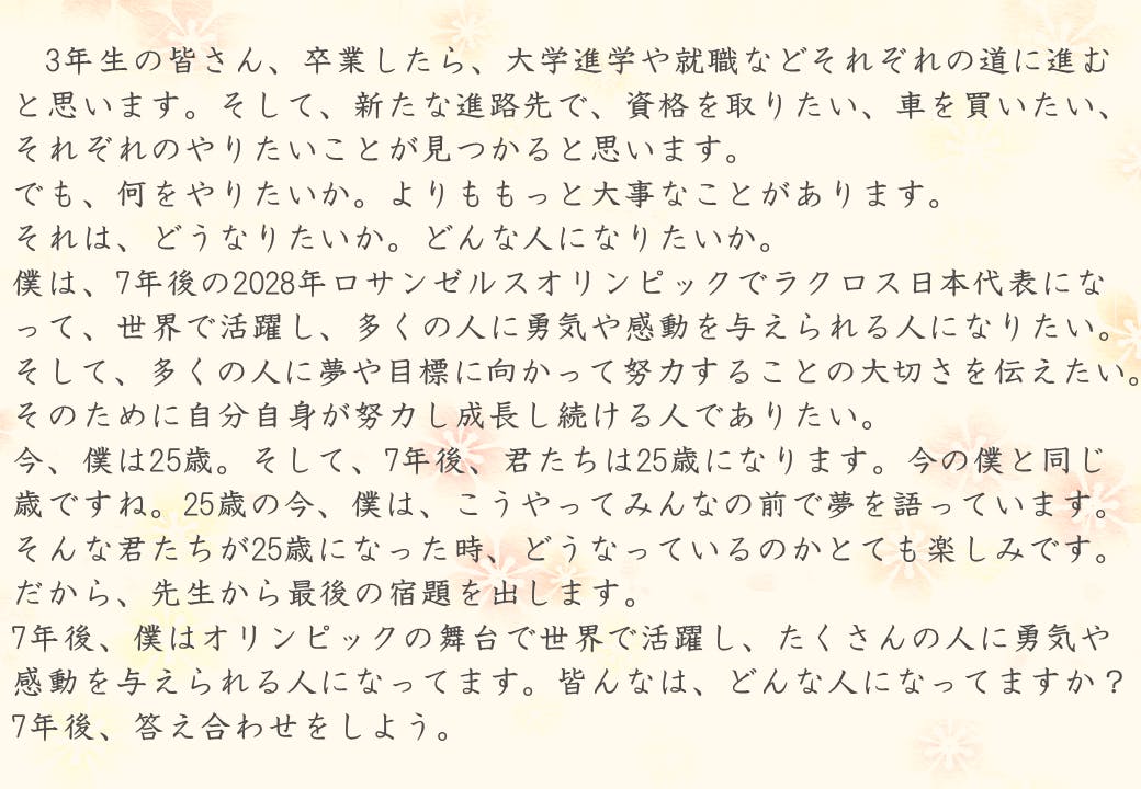 だからこそ、この高校のラクロス部の指導者としてオリンピックに出て活躍することが僕ができる最大の恩返しであり、オリンピックに向けて努力する姿を見せることが子どもたちへの1番の指導であり、指導者として最高のあり方だと思っています。