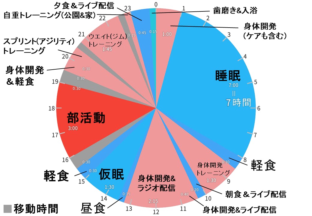 部活動(週5日)が無い日は、自主練習を行い、移動時間が無くなる分で、動画編集などを行っています。