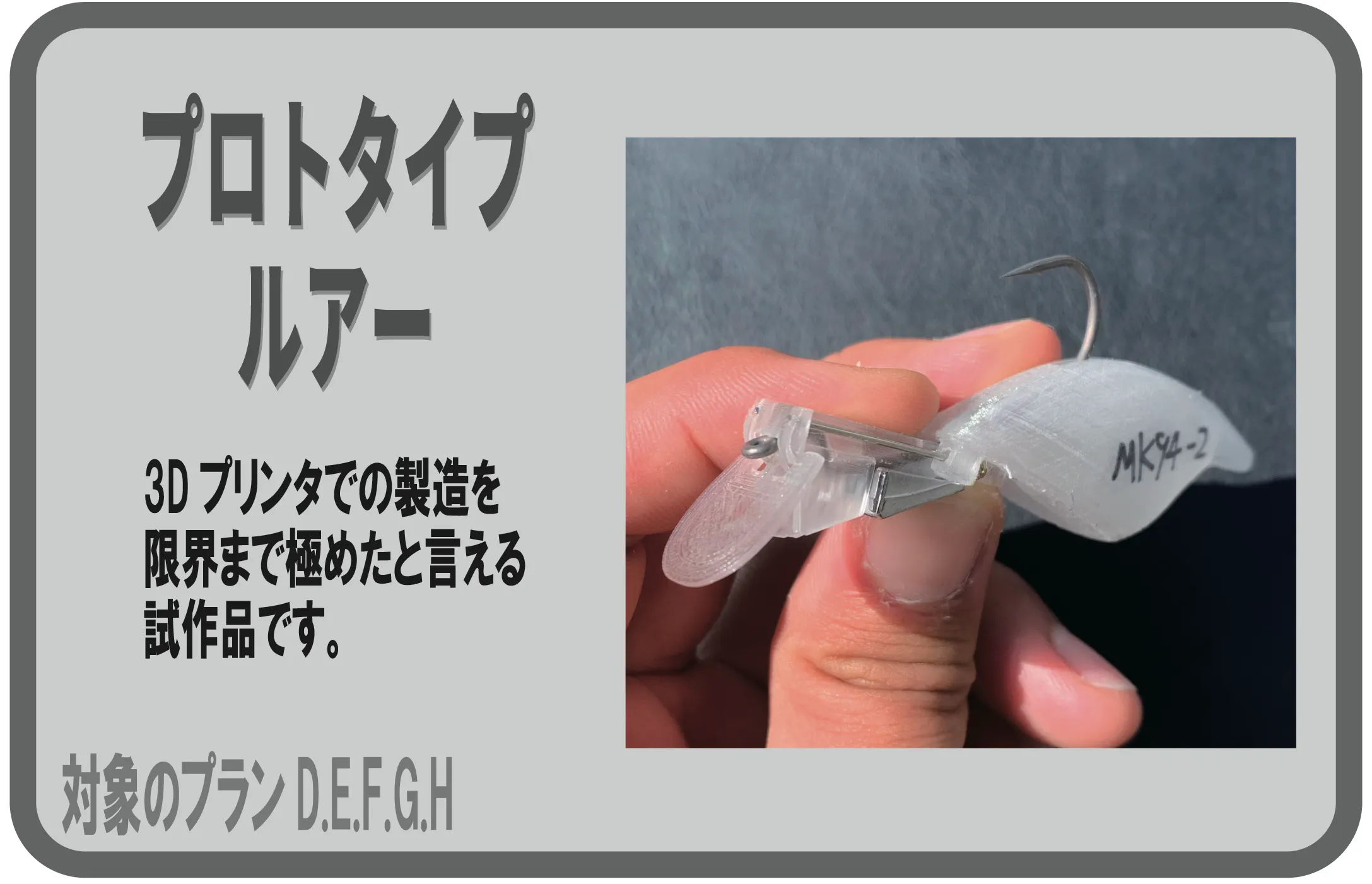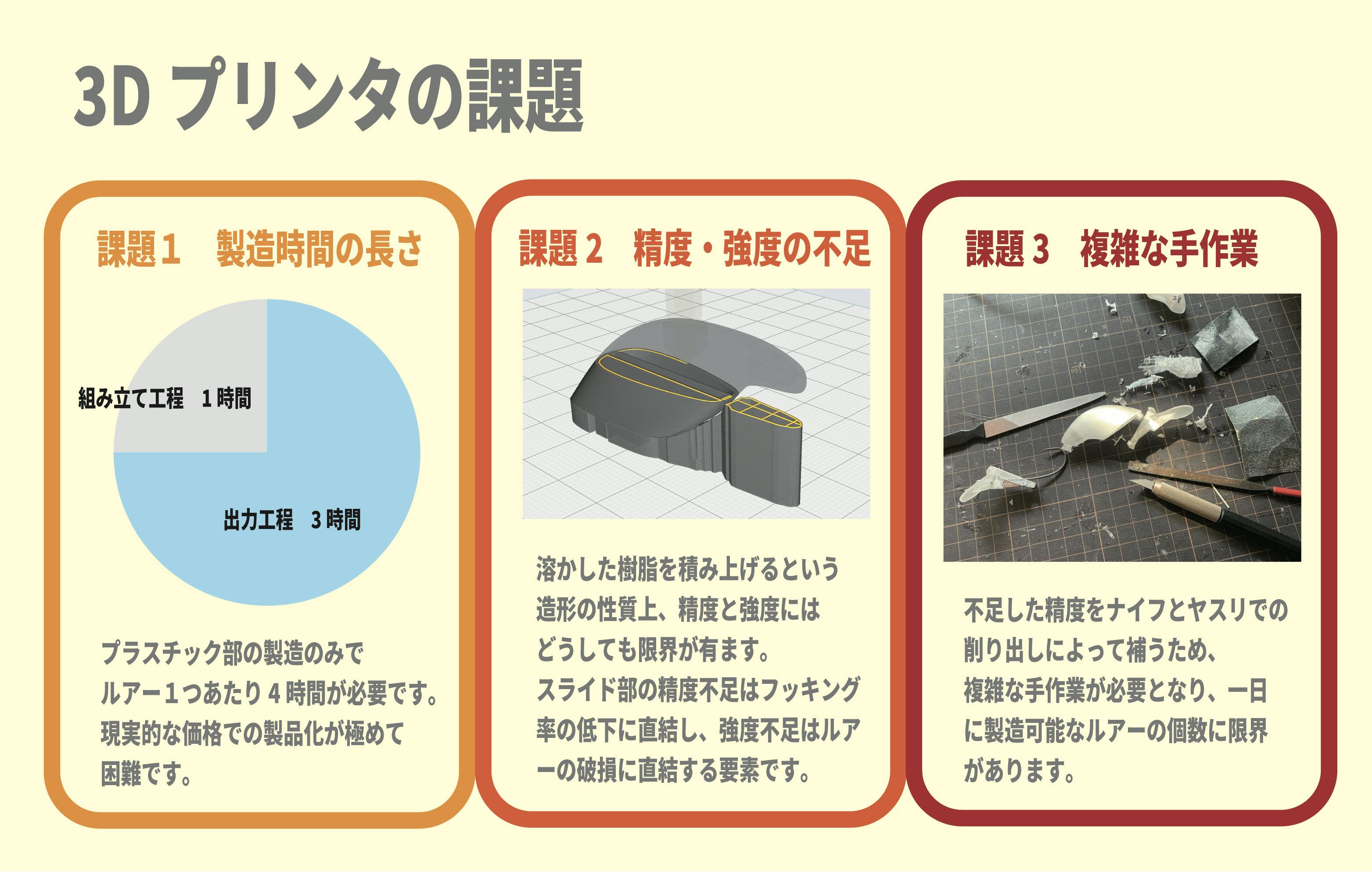 現在まで家庭用3Dプリンタを用いて試作開発を行ってきましたが、3Dプリンタによるルアーの製造には、製造時間の長さや、精度不足、強度不足といった課題があり製品化が困難でした。
