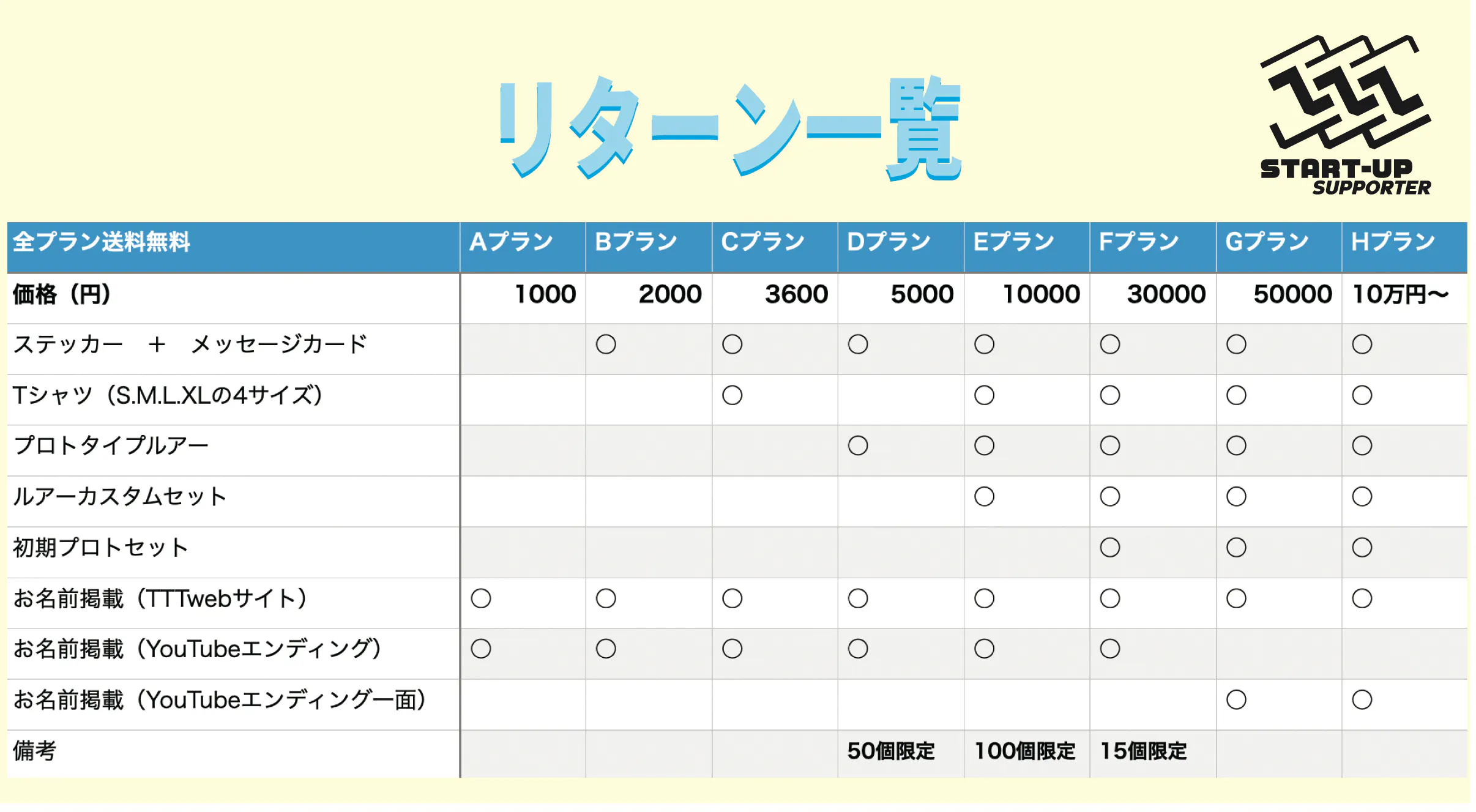 本プロジェクトをご支援いただいた方には、TTTのメーカー立ち上げにご協力いただいた証としてしまして「TTT START-UP SUPPORTER」のロゴが刻印されたリターンをお返しさせていただきます。
