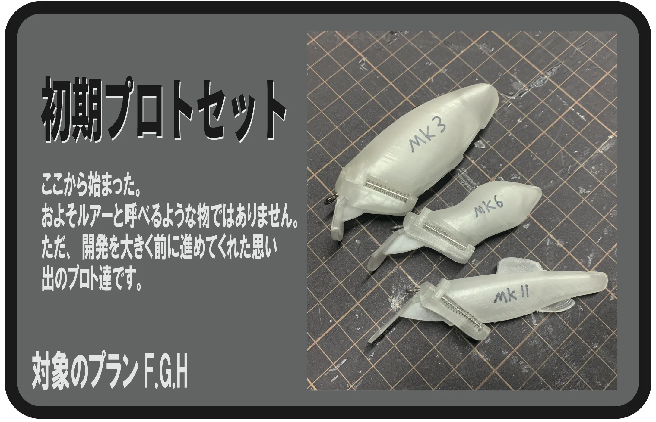 飛ばない、泳がない、キャスト時に空中分解したり、夏の暑さで破損したり、これまで、フックを内蔵したプラグの開発を4年間続け多くの壁にぶち当たってきました。設計上のジレンマやどうしようもない欠陥が見つかっても、解決方法は世に存在せず、自分が諦めたら、見限ってしまったら、そこでこのアイデアは、機構は、ルアーは、終わってしまう。その一心で開発を続けてきました。