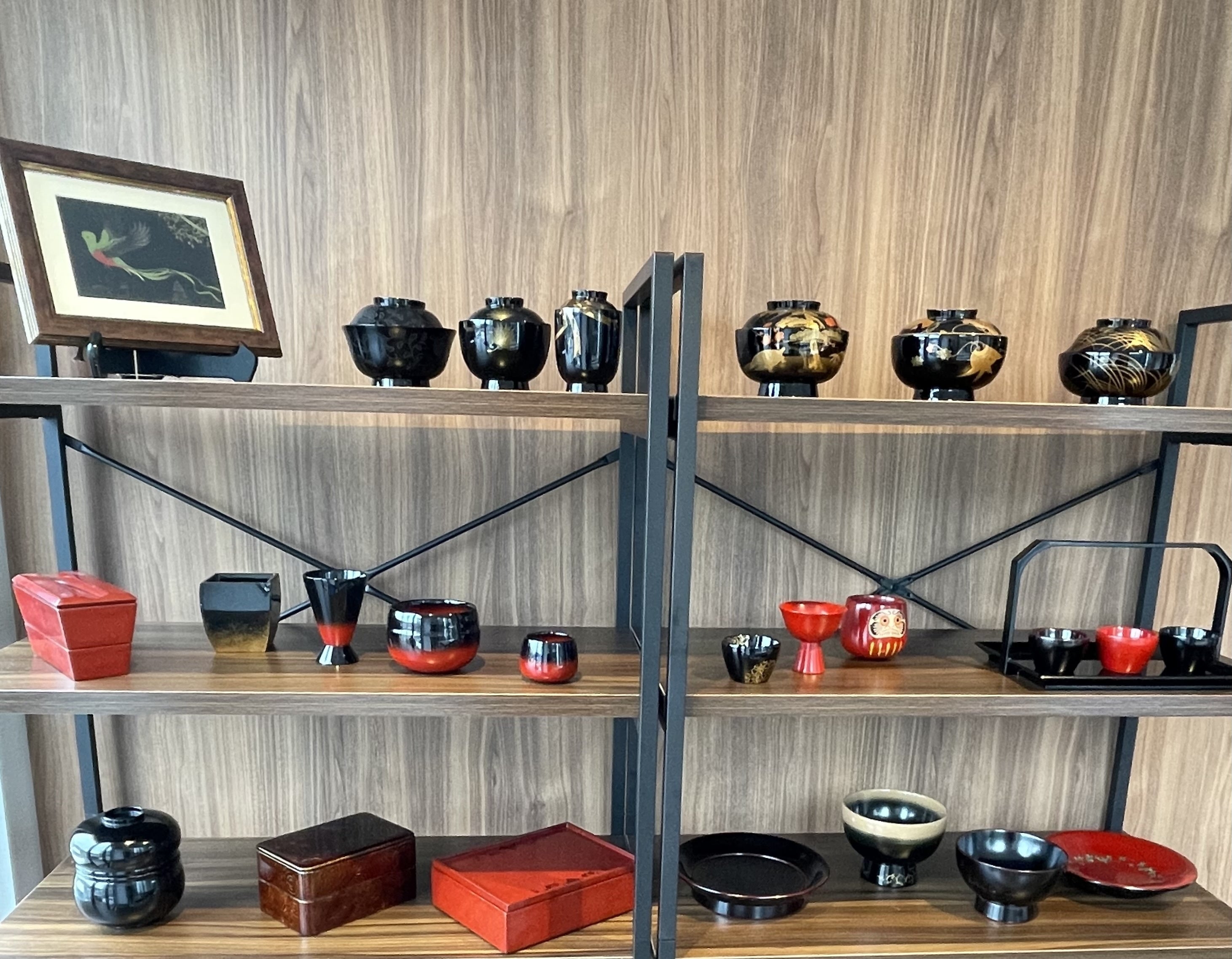 トレーラーハウス内に救出された輪島塗を飾ることで空間が華やかになっています。建物が倒壊しながらもたくさんの製品たちが無事でいてくれたことを嬉しく思っています。
