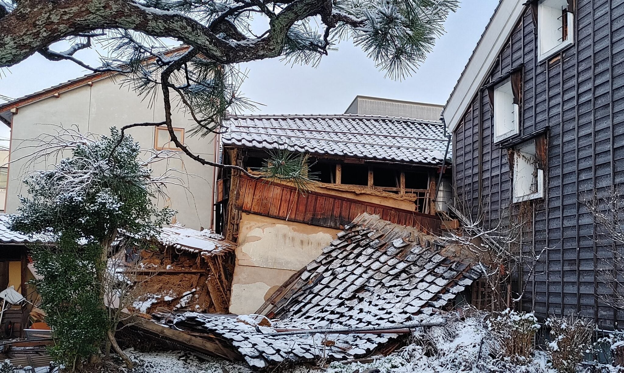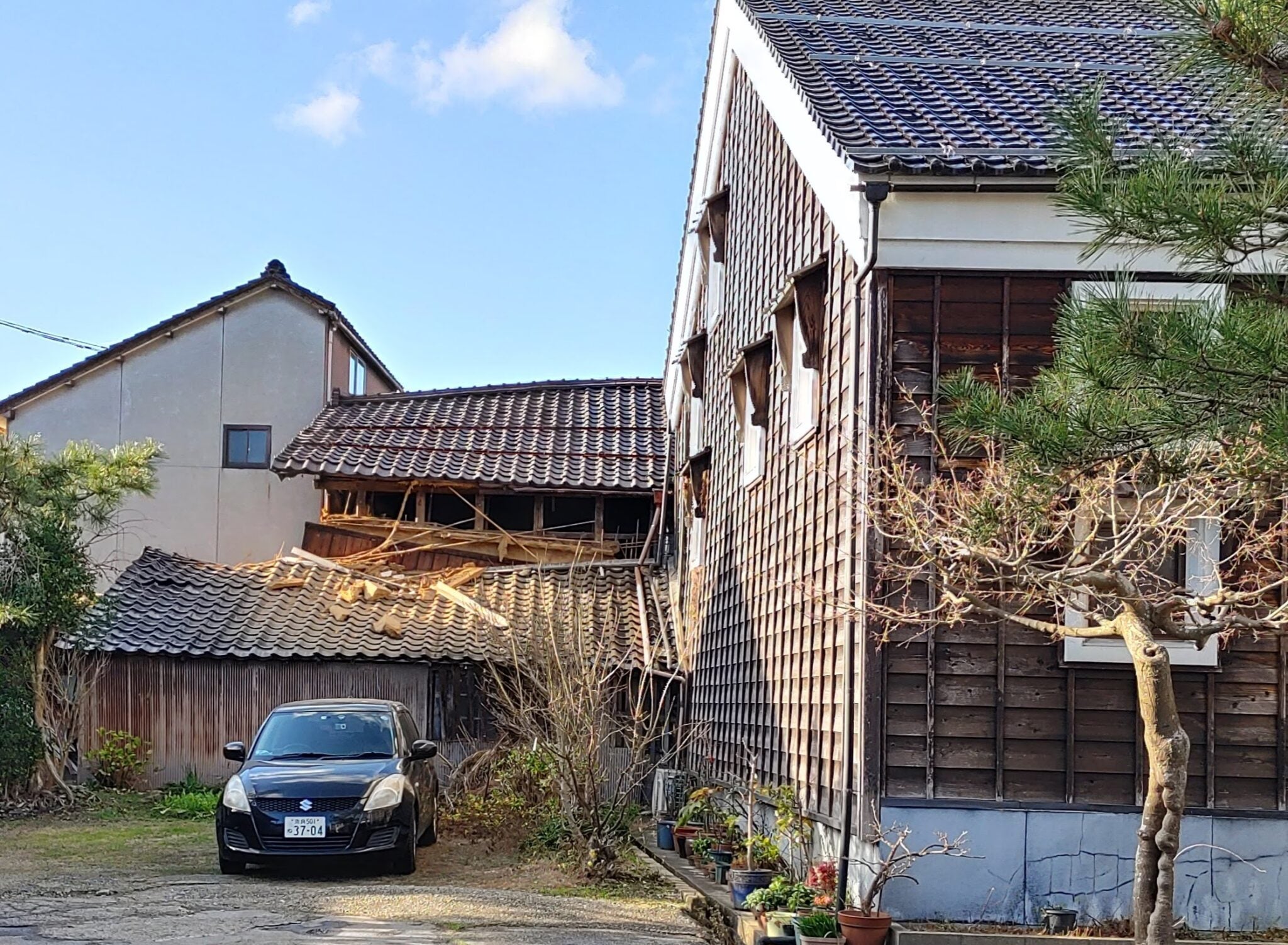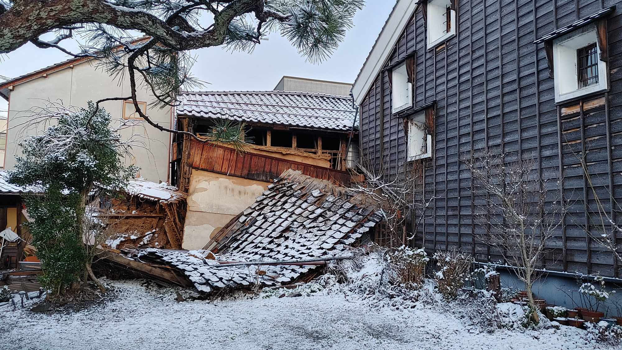 完全に下屋が倒壊し、ボロボロになってしまいました。