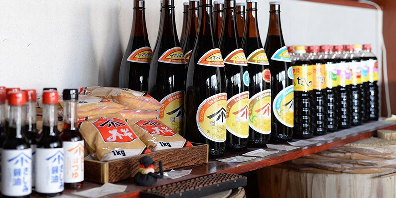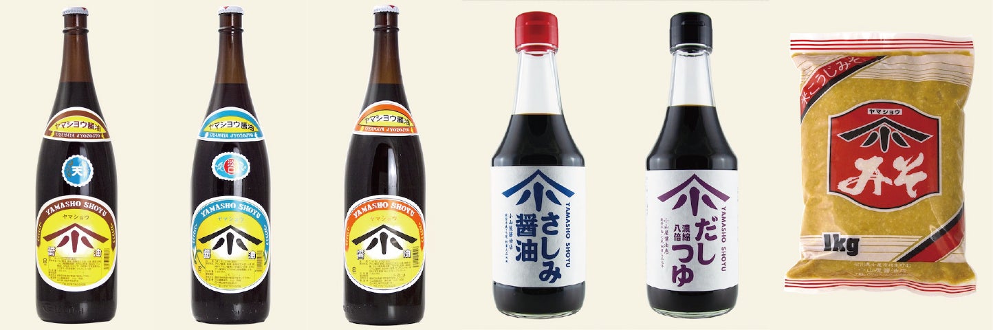 左から「天醤油」「淡口醤油」「旭醤油」「さしみ醤油」「だしつゆ」「ヤマショウ味噌」