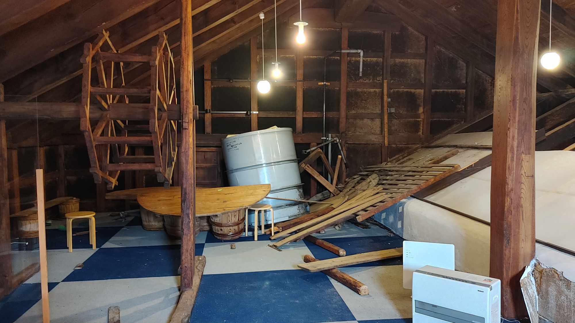 3. 井戸水の汲み上げポンプと貯水タンク(醤油蔵二階)
