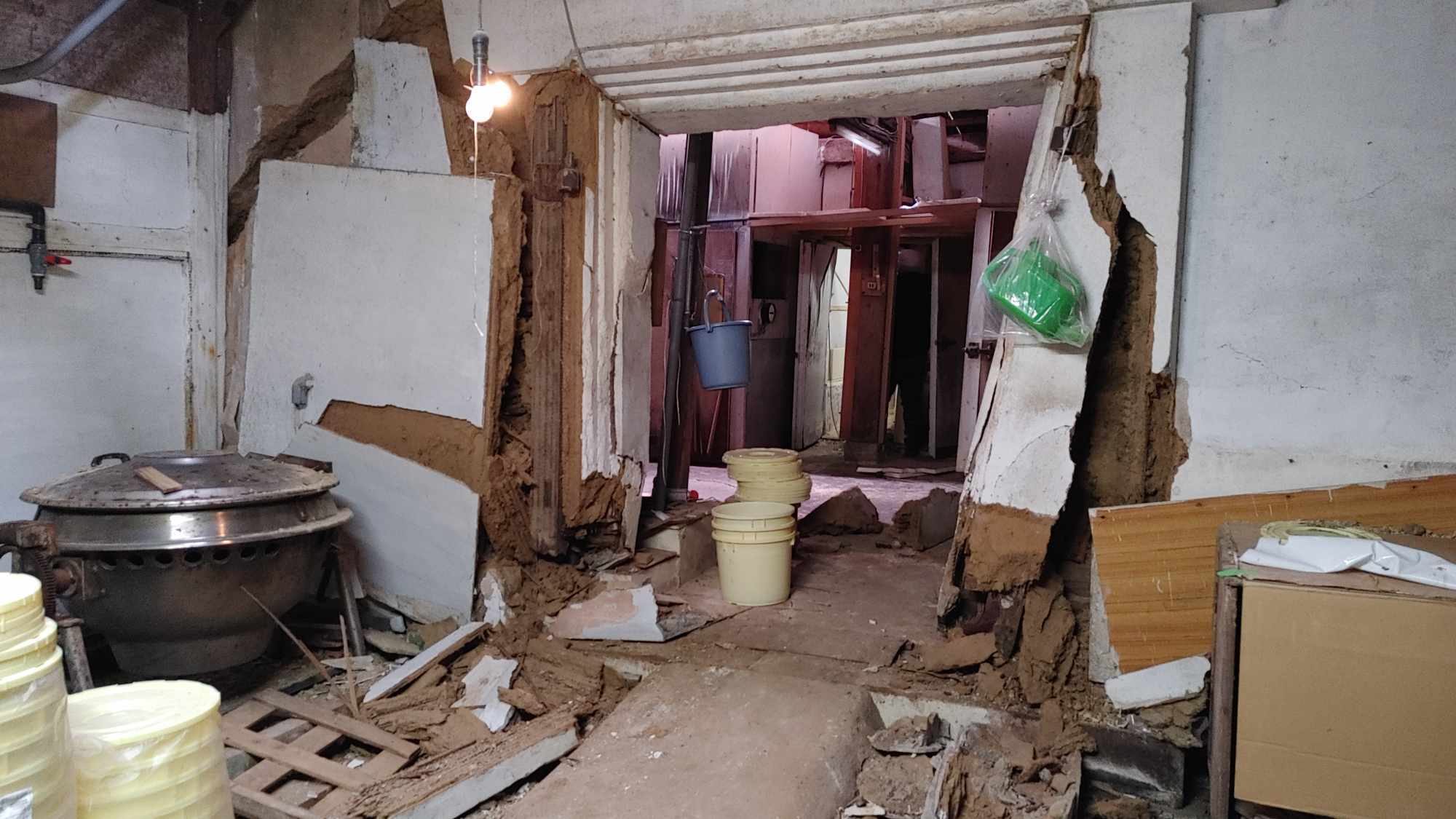 建物が傾き、壁の至る所がひび割れ剥がれ落ちています