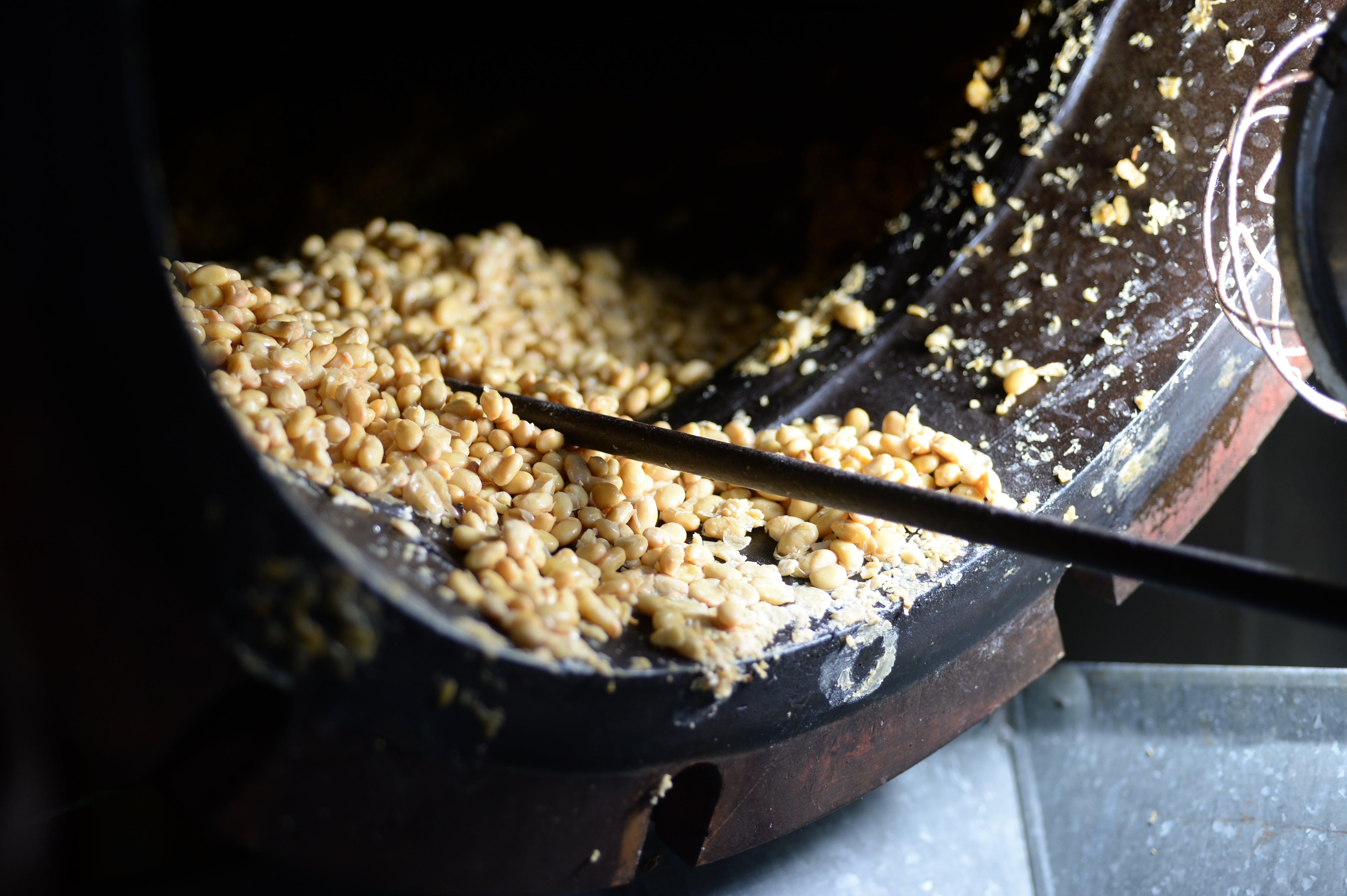 画像は蒸した大豆を出しているところです。