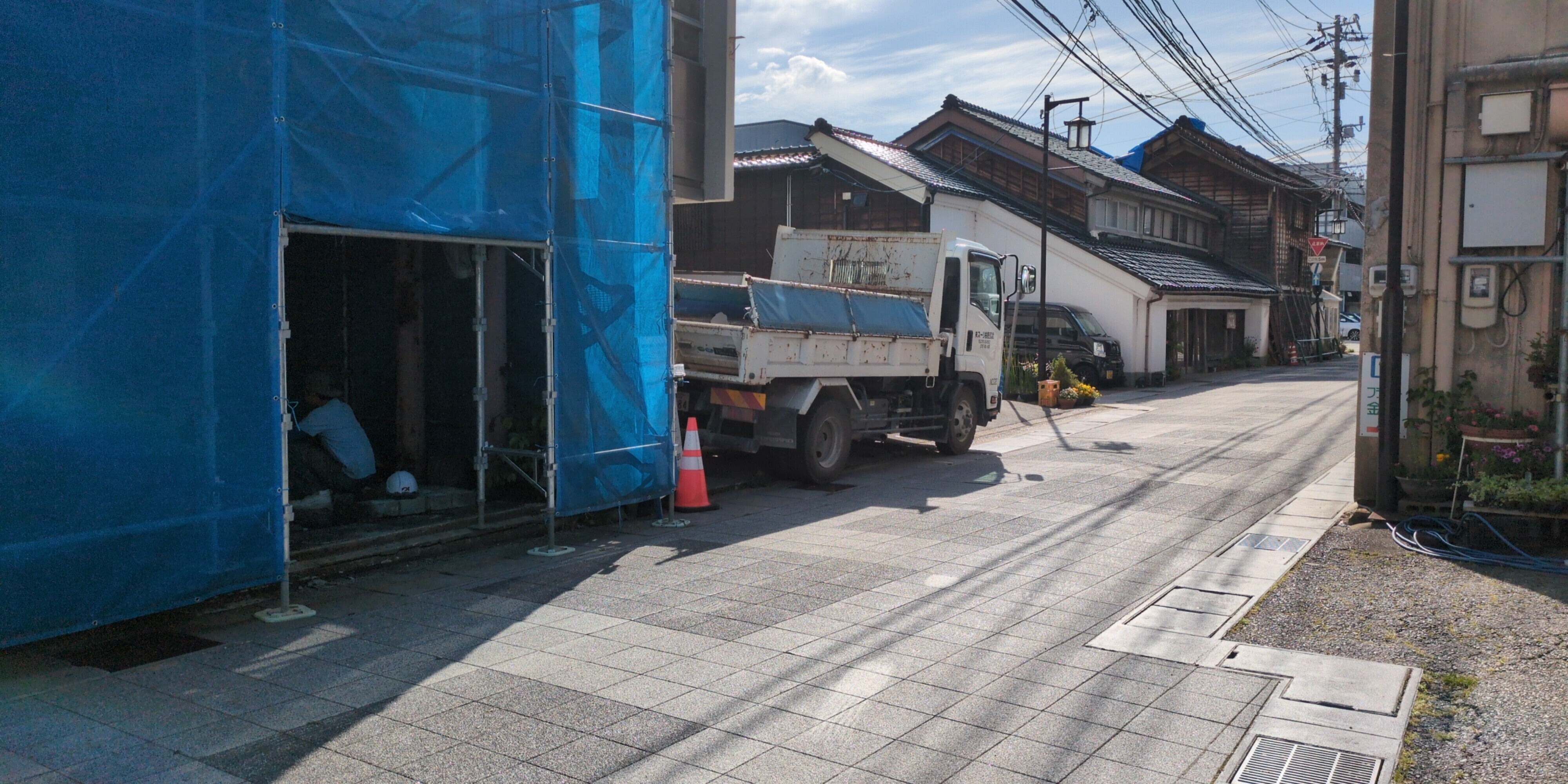 画像の奥に瓦を外しているところが見えると思います。お寺さんは大きいので一ヶ月以上はかかりそうです。境内にダンプやショベルが渋滞しています(笑)