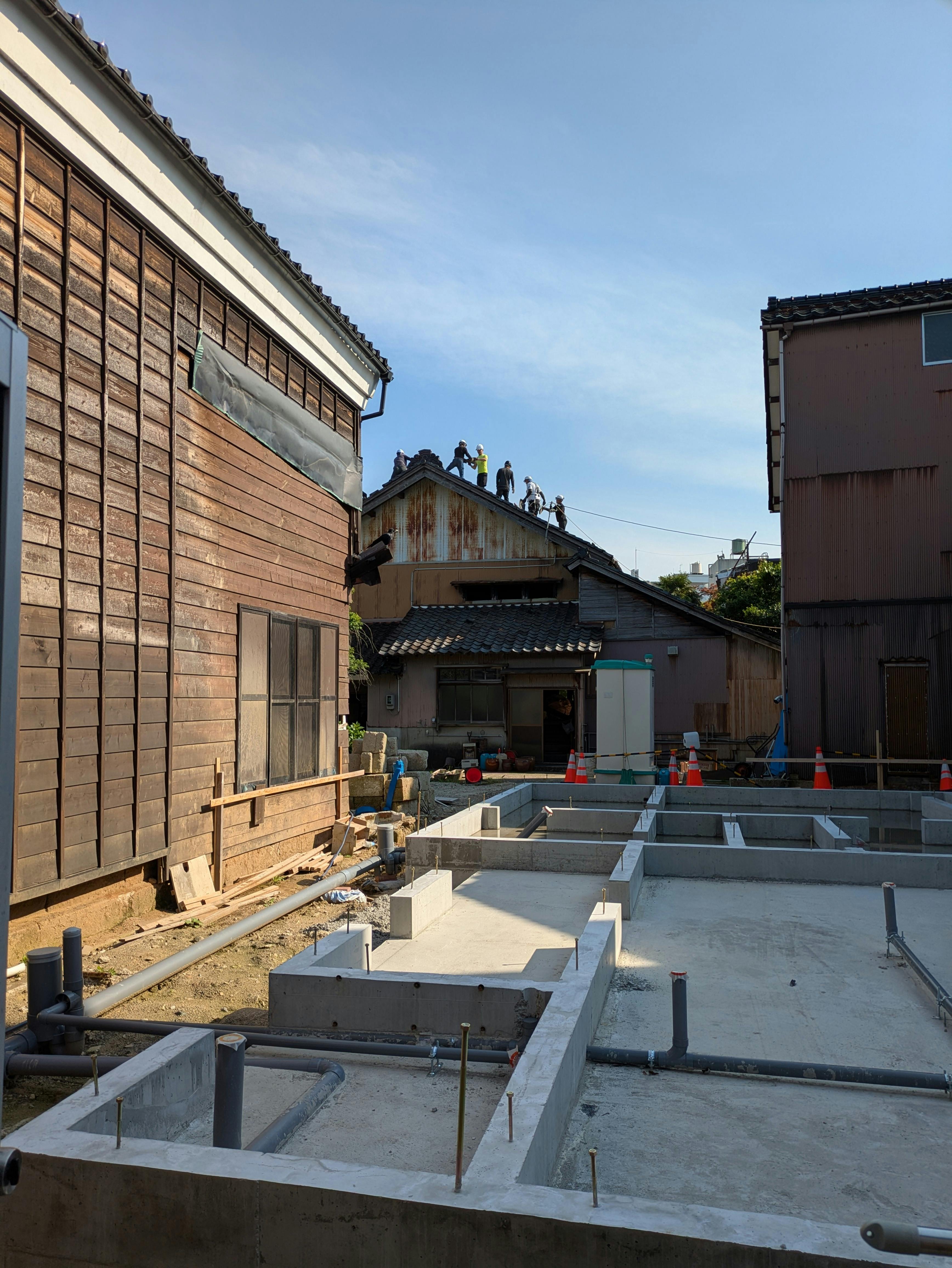 基礎工事は終わったのですが、隣のお寺さんの解体が先月から始まり、終わってからということになりました。