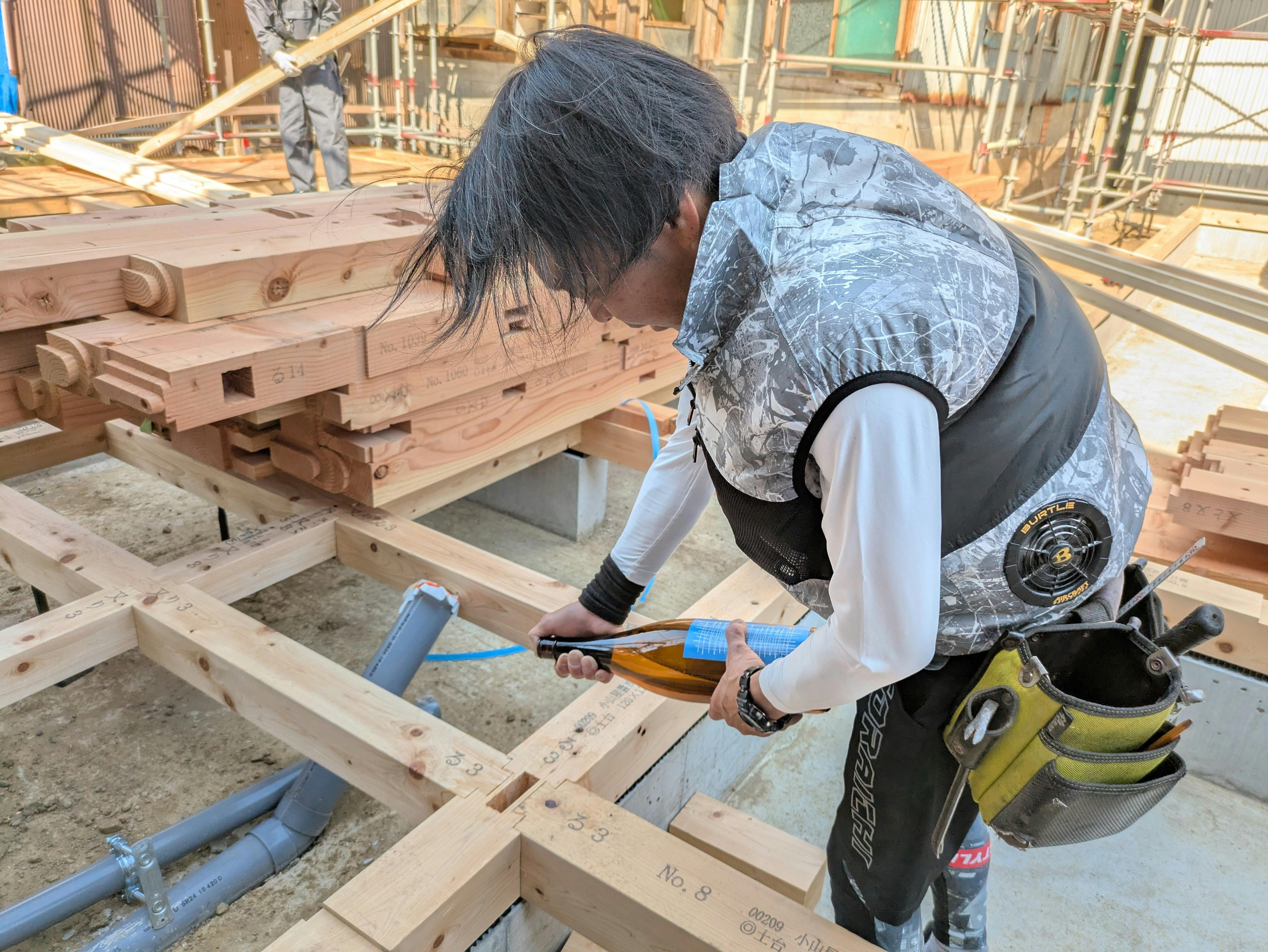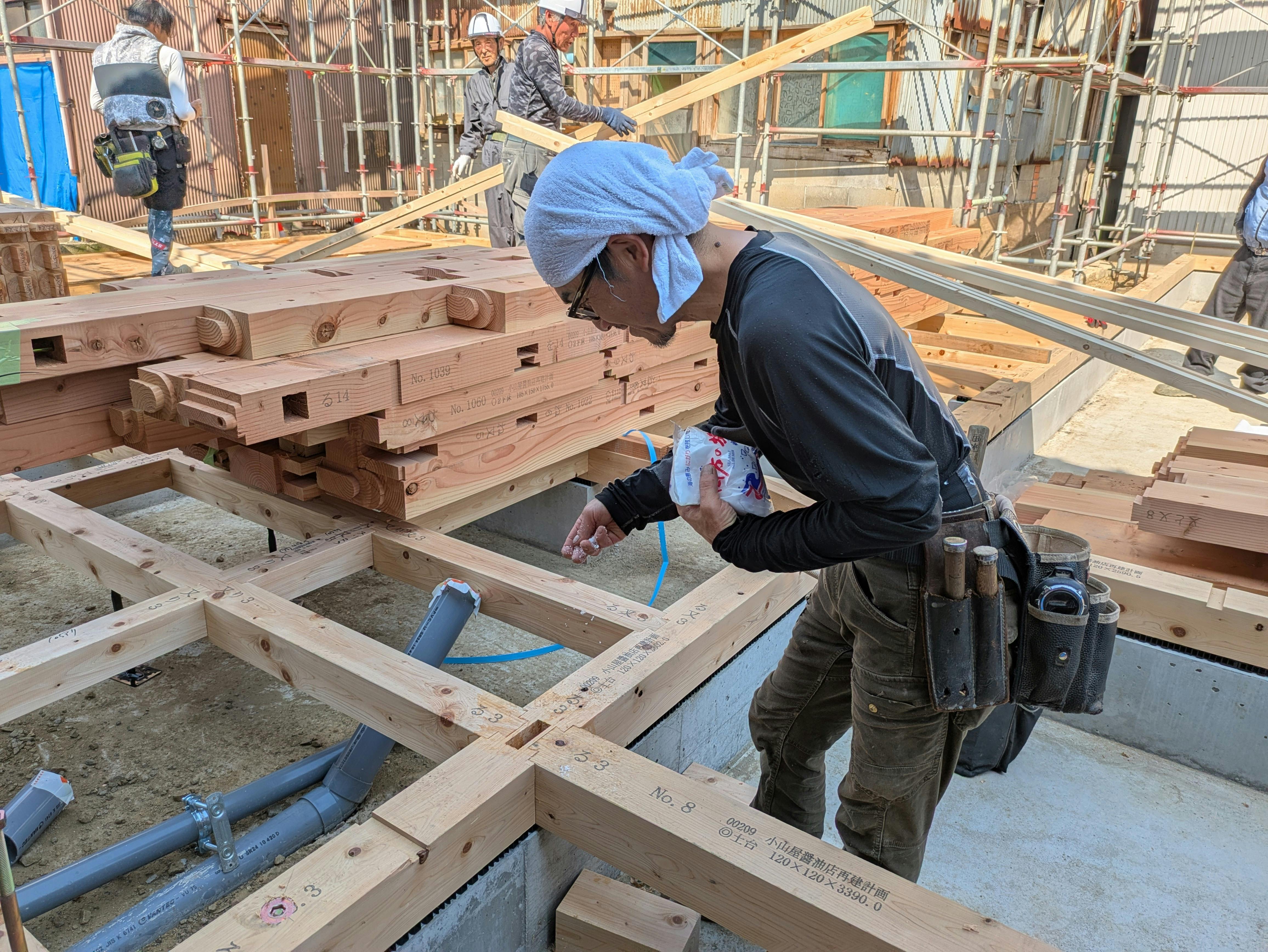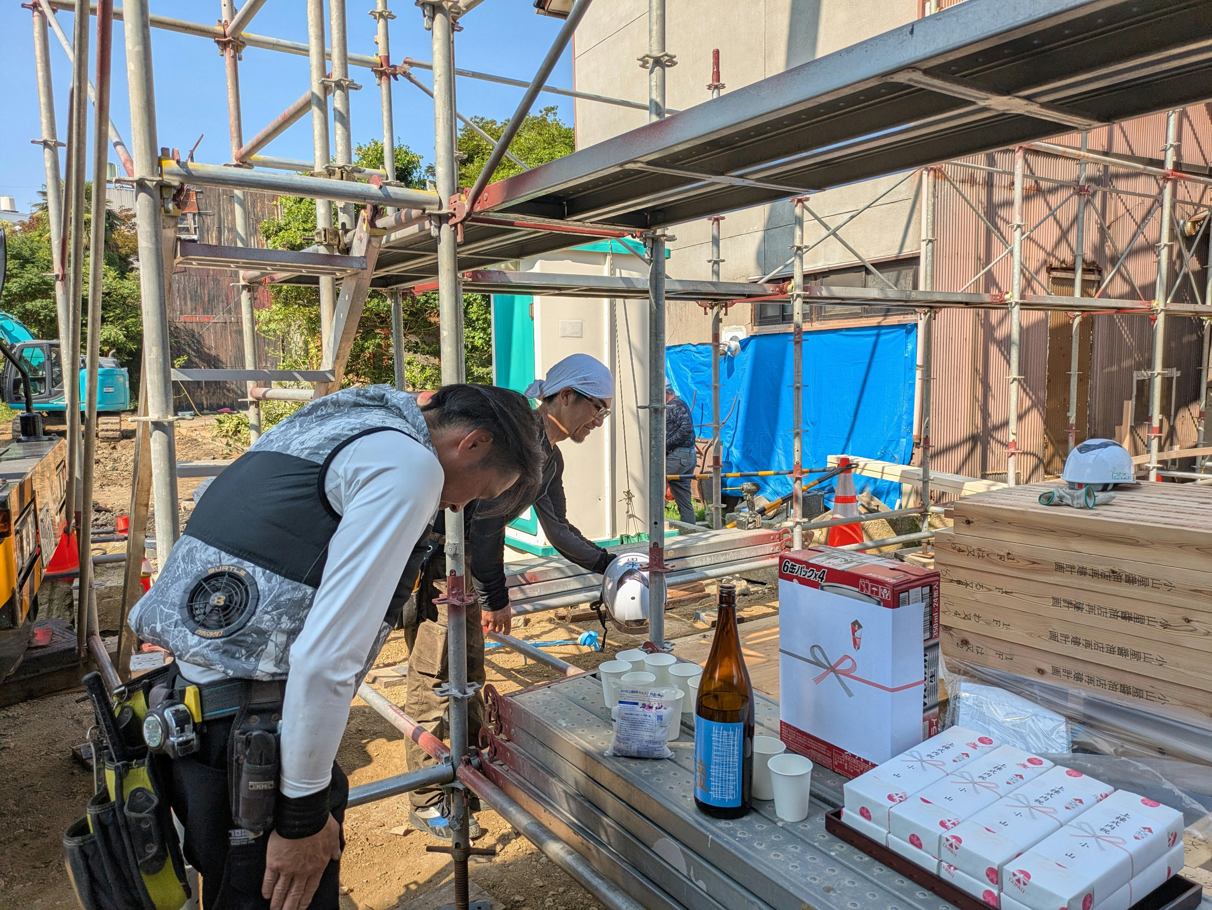梅雨の時期ながらお天気に恵まれ、とても良い棟上げの日となりました。