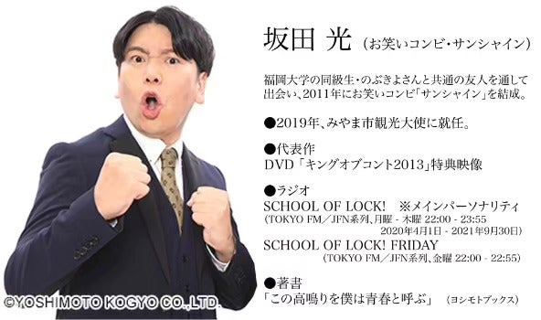 今回もまたジャンルを超え、お笑いの世界からキングオブコント準決勝進出の実力派お笑いコンビ「サンシャイン」 (吉本興業)より、坂田光さんのご参加が決定しました!