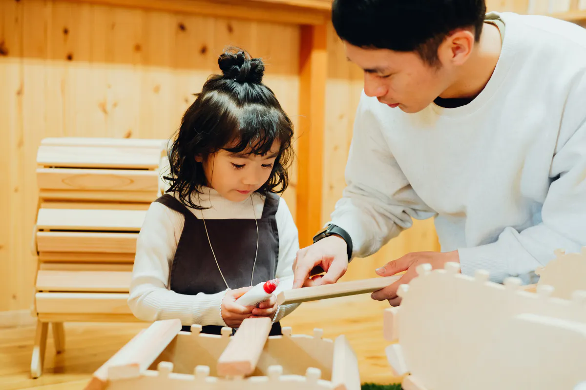 釘やビスを一切使わずゴムハンマーと木工用ボンドで組み立てるため、小さなお子さんでも安心して組み立てられる椅子づくりキットです。
