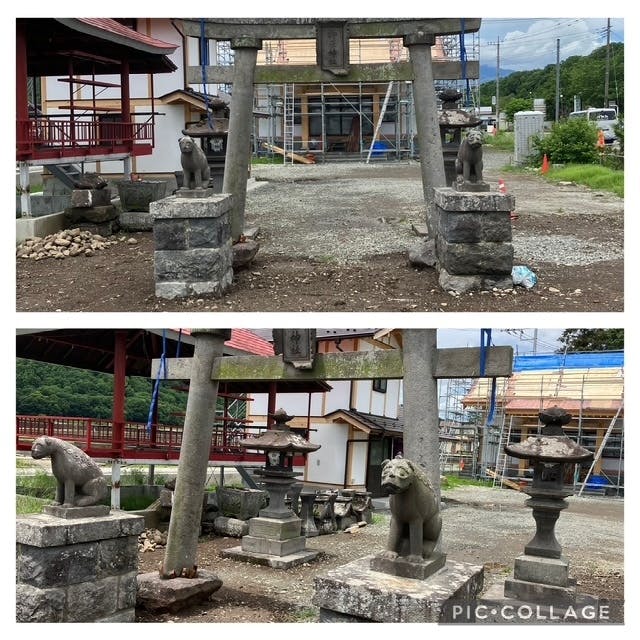 境内の工事ができるようになり、5月24日現在で元の鳥居と狛犬、石灯篭の一基が元の配置に戻りました。