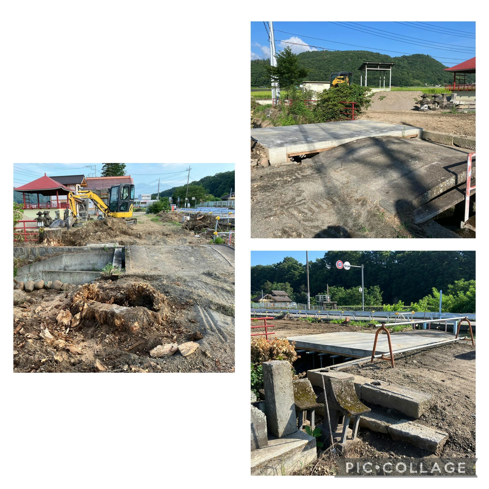 神社参道を横切る藤井堰にかかる石橋(太鼓橋)の移築工事中です。
