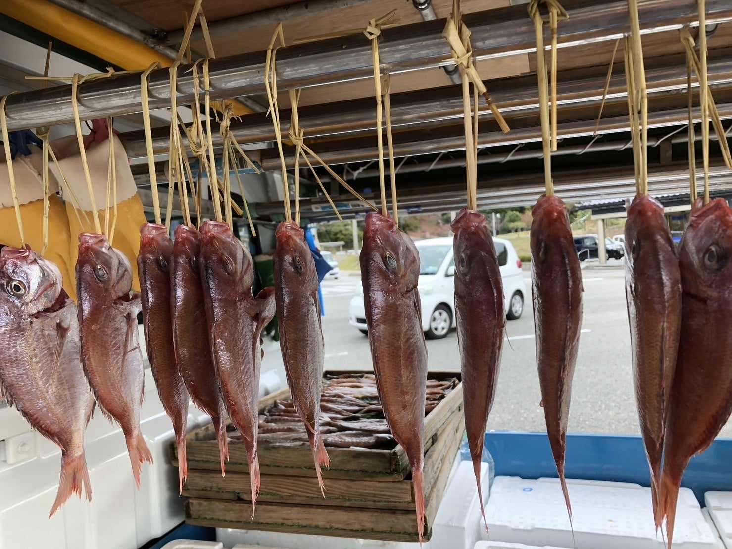 主力商品の一つ、主に底引き船で水揚げする赤カレイを干したものになります。捌いて洗ったカレイを塩に漬けてワラでつなぎ、干します。身は淡泊で、ほんのりと塩味が効いているので、そのままご飯と一緒に頬張るのもよし、醤油を少し垂らし、酒のつまみとして少しずつ箸でつつくもよしの最高の魚です。