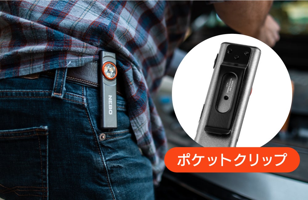 NEBOポケットライトの背面に、丈夫なポケットクリップが備わっています。
