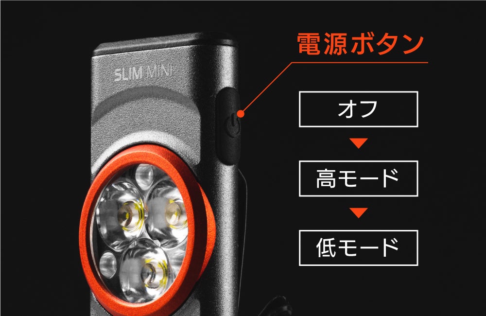 2つの照明モード(強→弱→OFF)をすばやく切り替えることができます。
