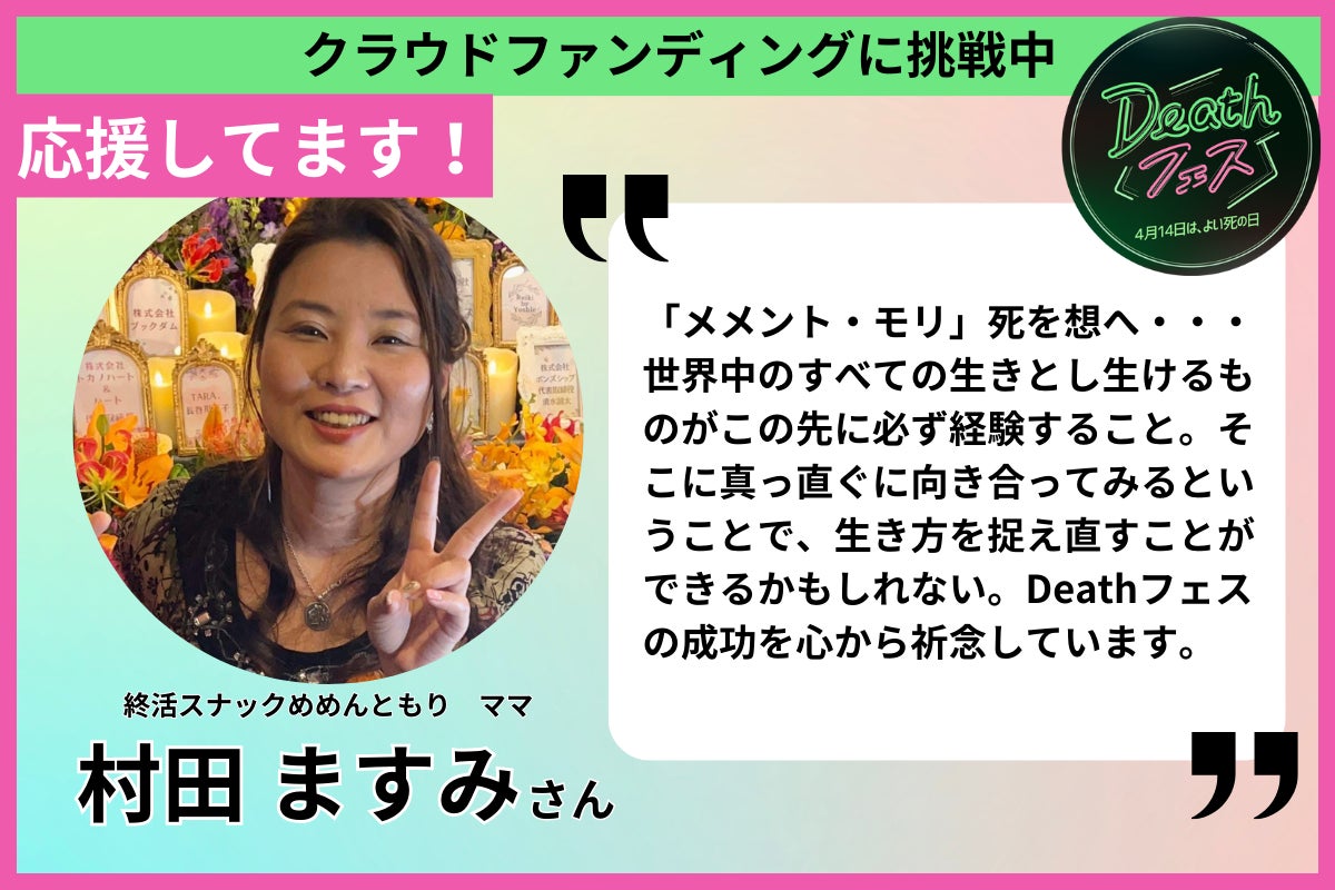 終活スナック めめんともり ママ 村田ますみさんから、応援メッセージをいただきました。ありがとうございます!