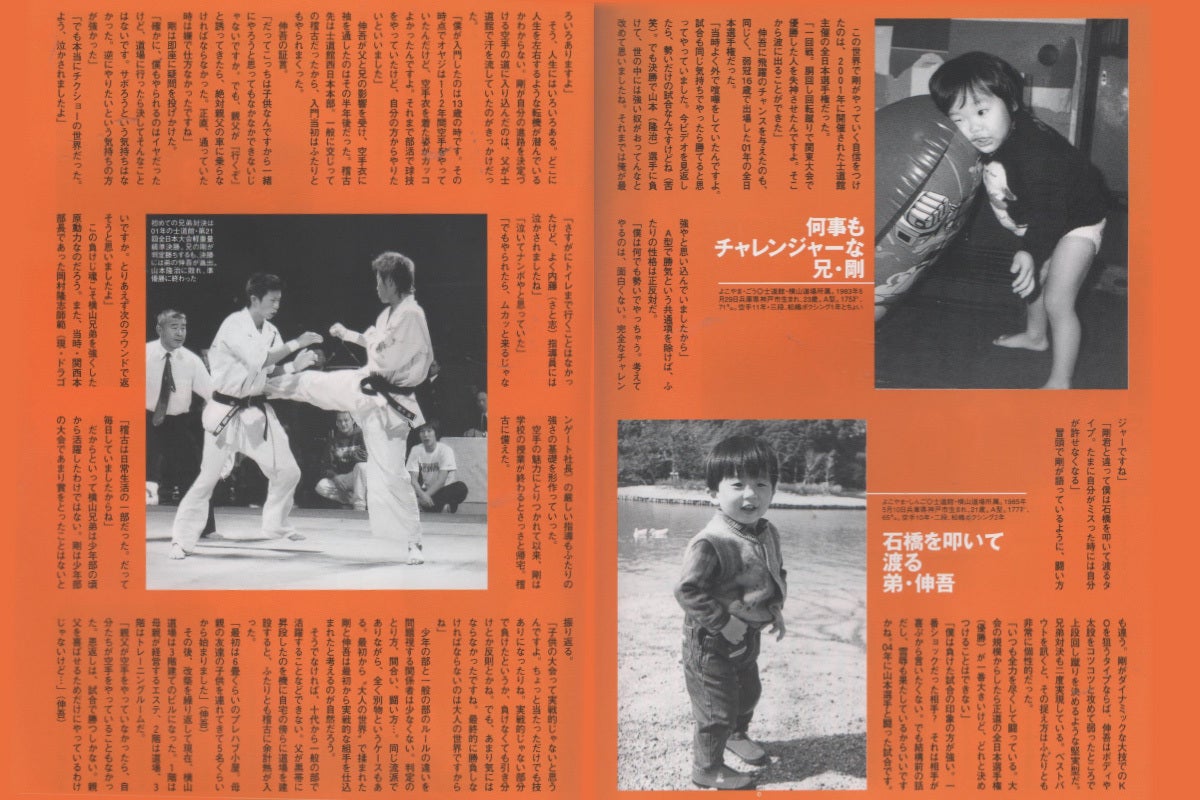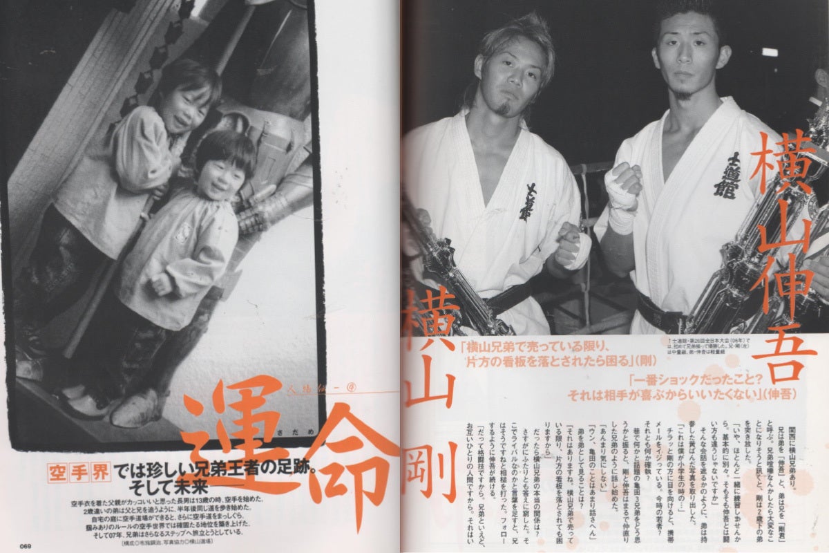 僕は兵庫県出身で、空手をしていた父親と兄の影響で、小学5年生で空手をはじめました。これは僕にとっての大きな自慢なのですが、一緒に空手の修行を積んだ兄というのが、実は「天才空手家」と呼ばれる、あの「横山剛」です。空手を始めた当初は負けが続いたものの、中学3年生の頃に全国大会で優勝。高校2年生の頃には、2002年士道館全日本大会で兄弟対決の末に優勝し、史上初の17歳で「全日本最年少チャンピオン」になりました。しかし、その後間もなく大きな交通事故に遭いリハビリ生活を余儀なくされます。2年間のブランクを乗り越え、2006年士道館全日本大会で2度目の全国大会優勝を果たしました。2008年GRACHANフェザー級王座決定戦でチャンピオンベルトを獲得。その後は、空手の海外遠征試合や防衛戦にチャレンジしながらも、空手道場やジムでの「青少年育成」にも取り組み続けています。