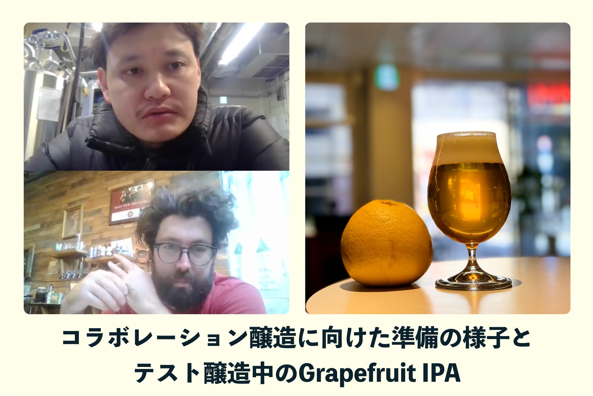 以降、もとより醸造長の下田が思い描いていた、「初心者も入口として楽しめる」「クラフトビールファンも納得」を両立するビールをどのような形を実現するのかアイデアを出し合い、テストバッチに取り組んで来ました。「ホップとフルーツのアロマの融合」というコンセプトをもとに、Culmination Brewing側とも議論をして、ついに2024年4月、今回の「いぬにひき」のコラボ醸造が実現することになりました。