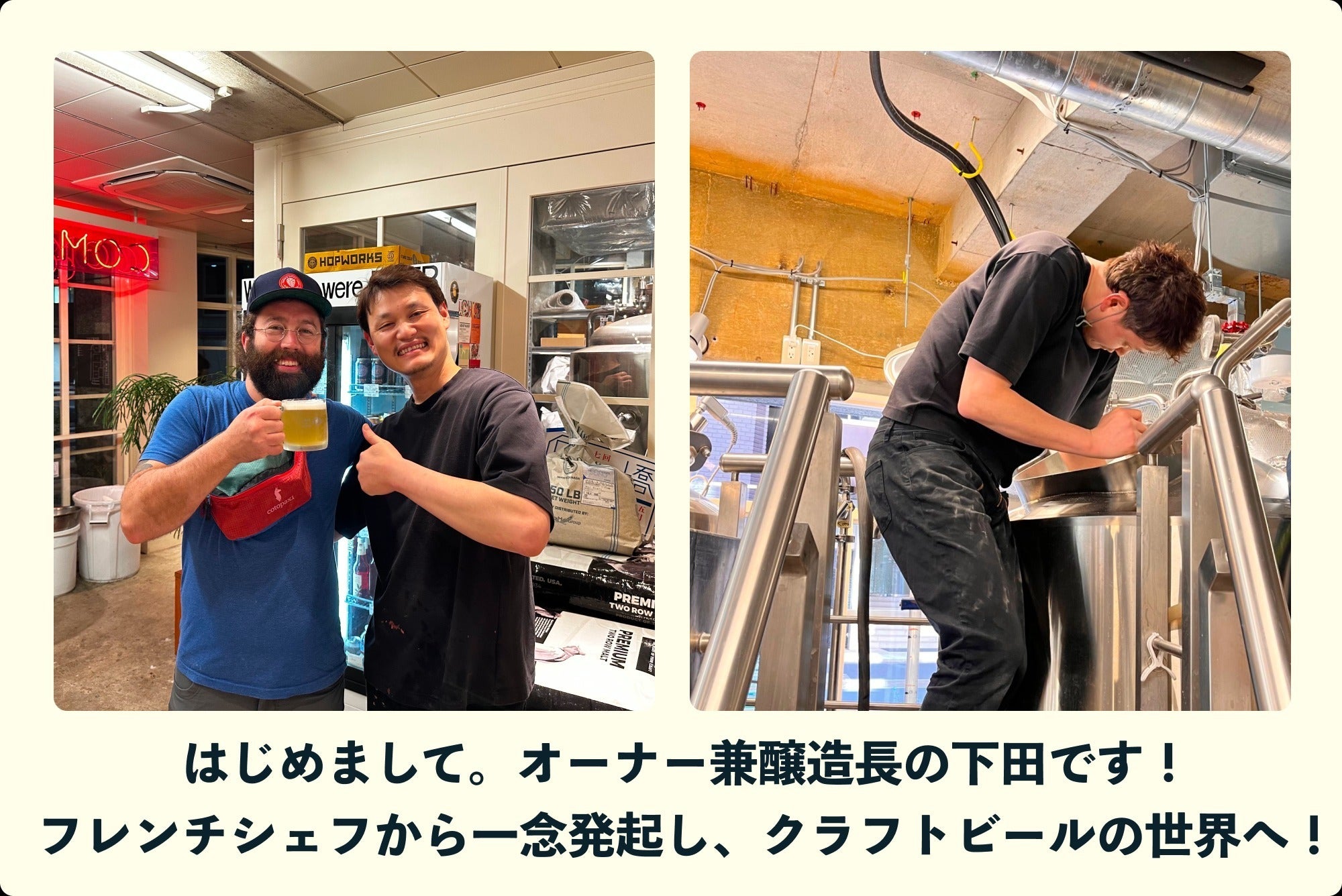 今回のコラボレーションの機会を実りあるものにするため、下田は1ヶ月現地に滞在し、現地の技術・思考プロセスを最大限吸収し、「2杯目のビール。」での醸造へと活かしていく予定です。現在準備は最終段階に入っており、融資の申請、ラベルデザイン、仕入の段取りなどに取り組んでいます。