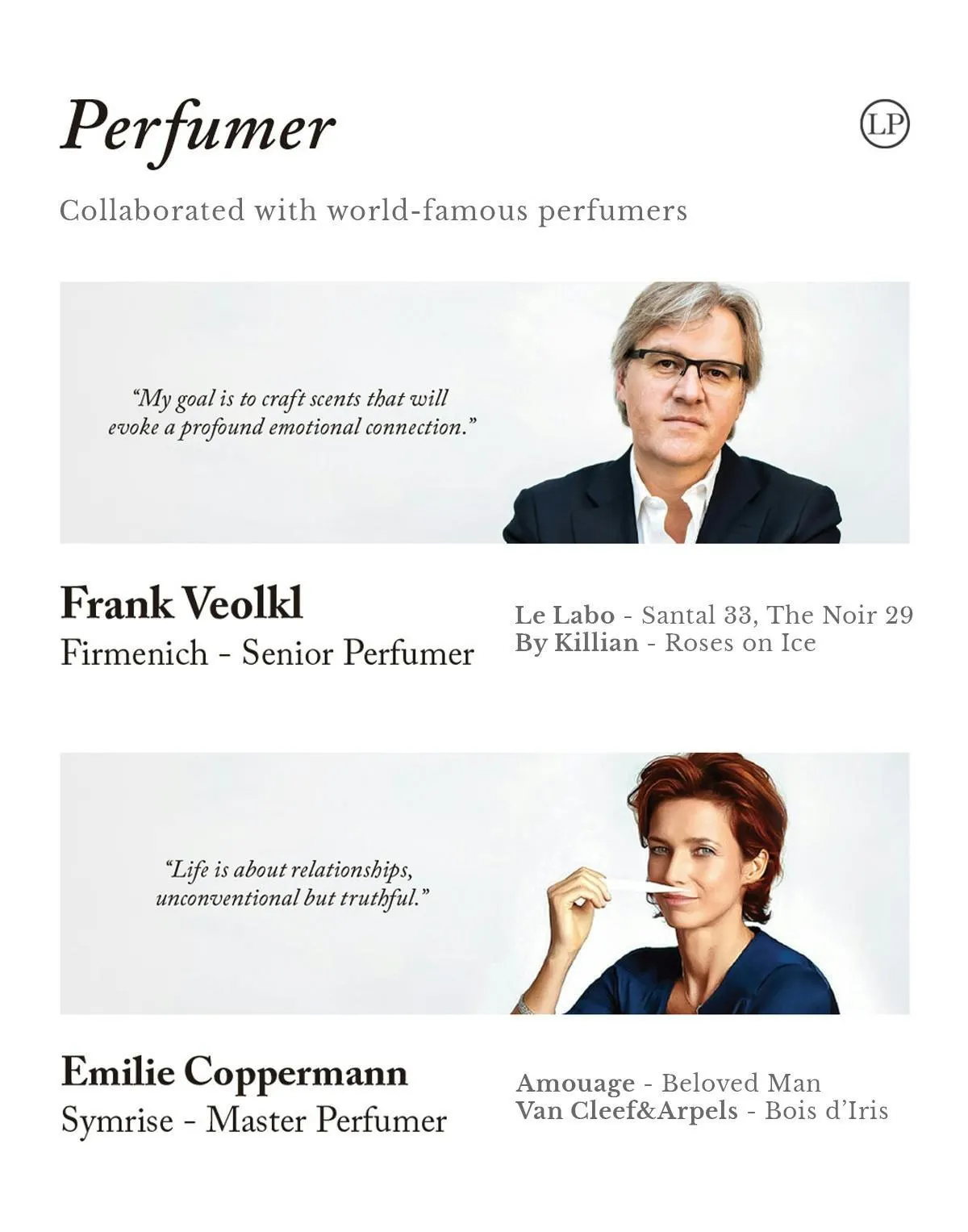 ルラボ(Le Labo)の「サンタル33」、「テノアール29」を調香したFrank Veoklとアムアージュ(Amouage)の「ビーラヴドマン」、「ヴァンクリーフ&アーペル」の調香士Emilie Coppermannが調香に参加しました。