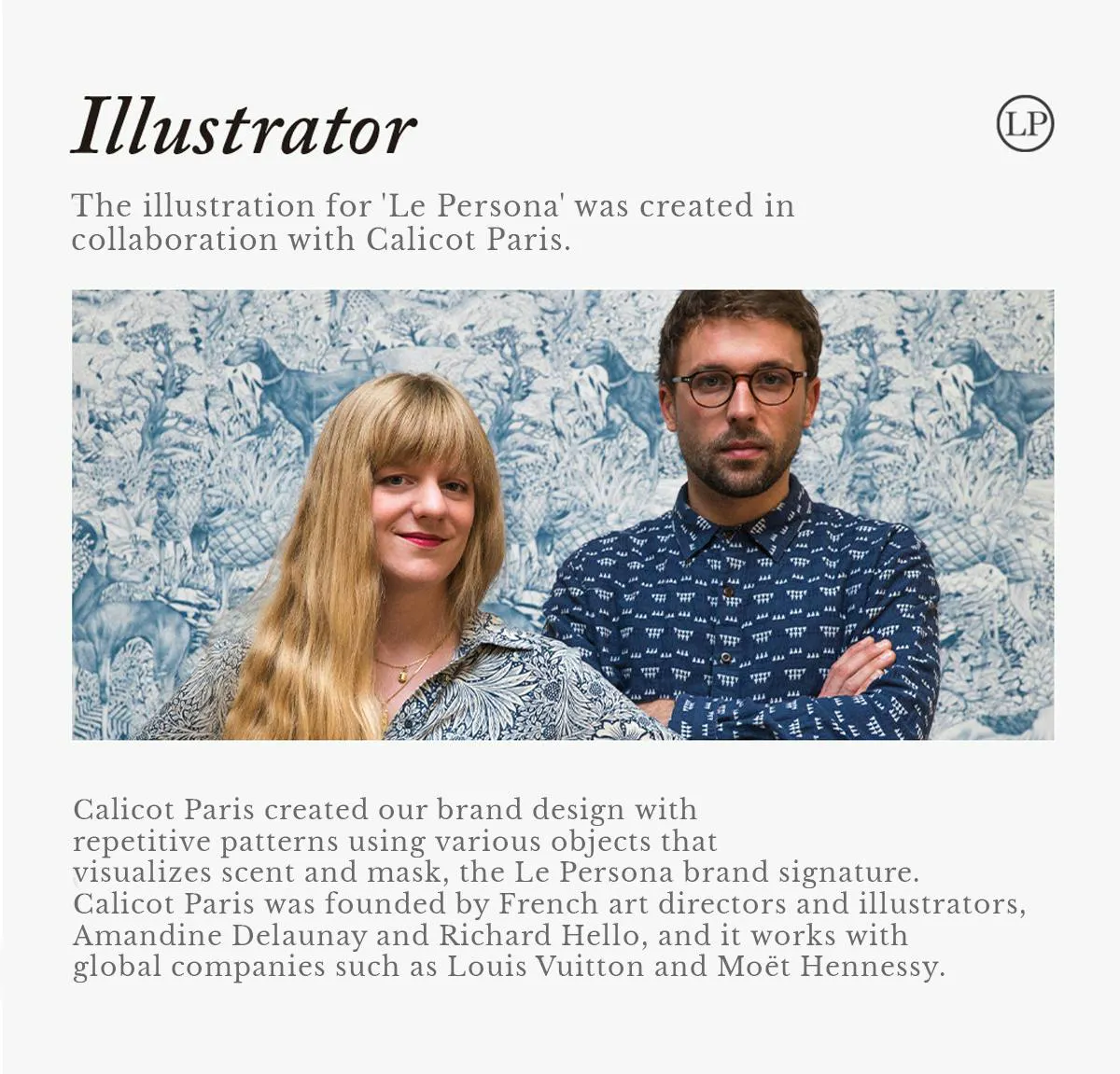 ル ペルソナの象徴である仮面と香りを象徴する様々なオブジェを入れ、ブランドのイメージと香りの双方を表現するイラストデザインが誕生しました。 Calicot Paris社は「ルイ・ヴィトン」「モエ・ヘネシー(Moöt Hennessy)」のようなグローバル企業と協力しています。