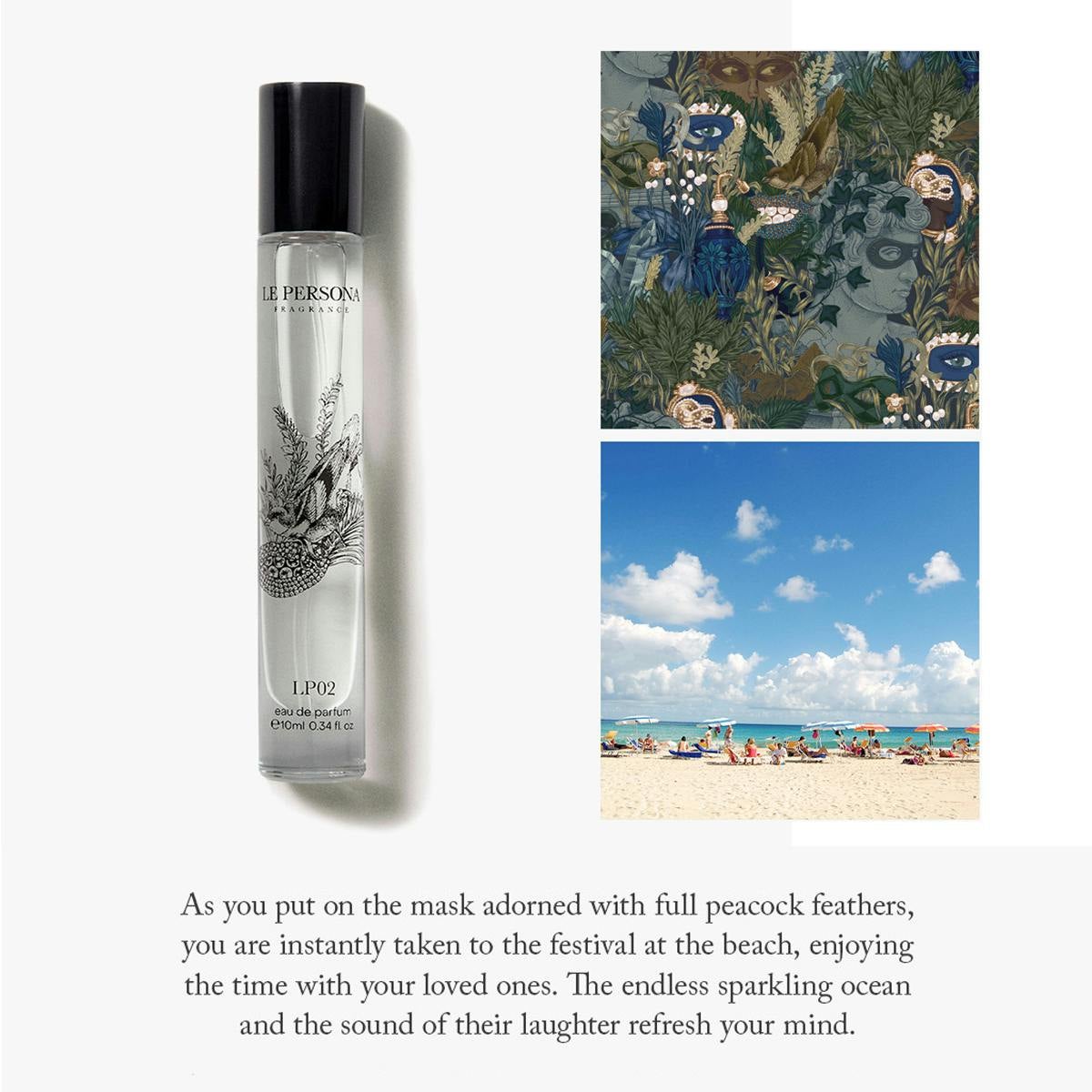 大きな孔雀の羽の「ル ペルソナ」を付けた瞬間、あなたは大好きな人たちと一緒に海辺で祭りを楽しんでいるような気持ちになります。人々の笑い声が聞こえてくるような、果てしなく輝く海を感じるその香りは疲れた日々の癒しになります。