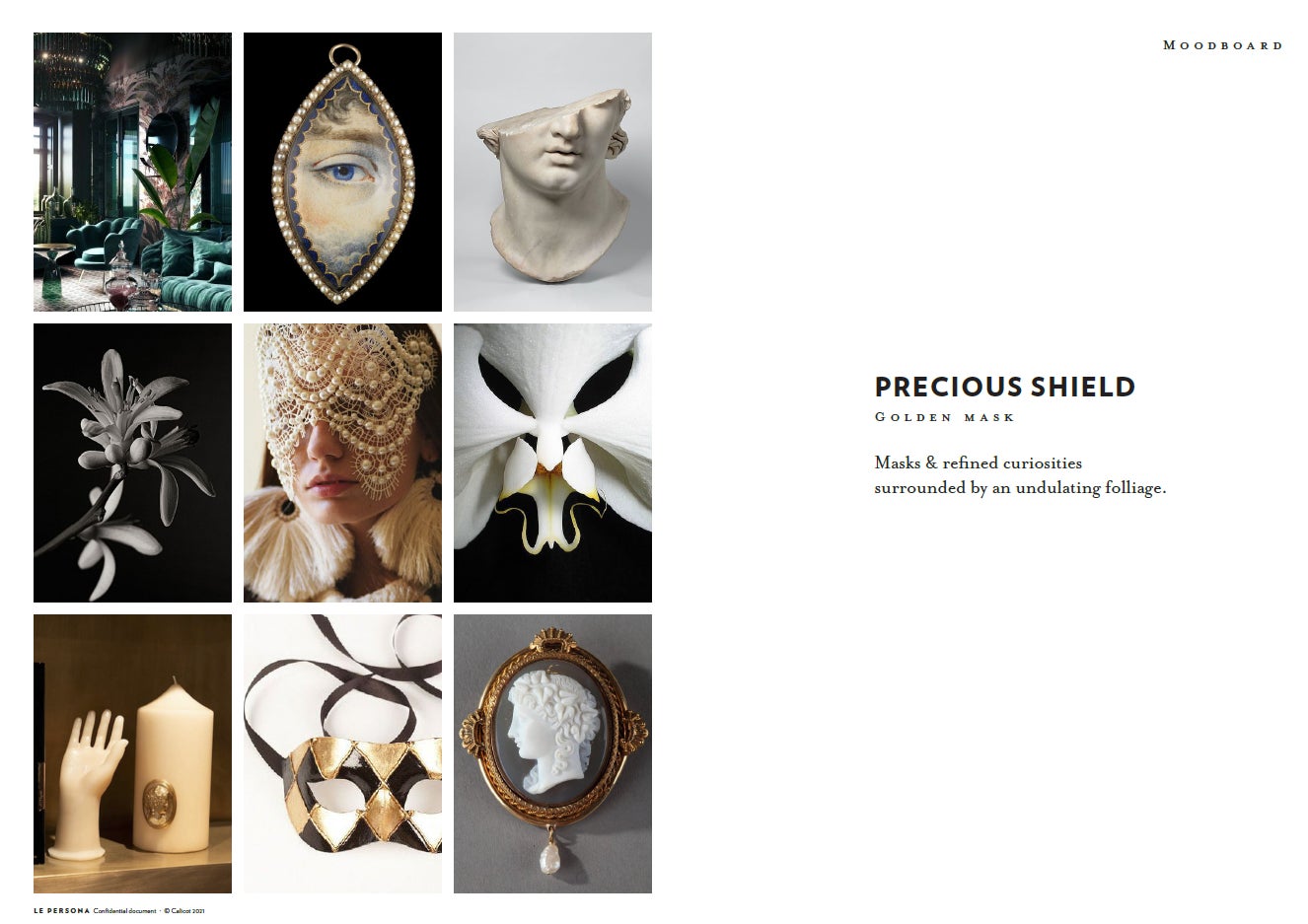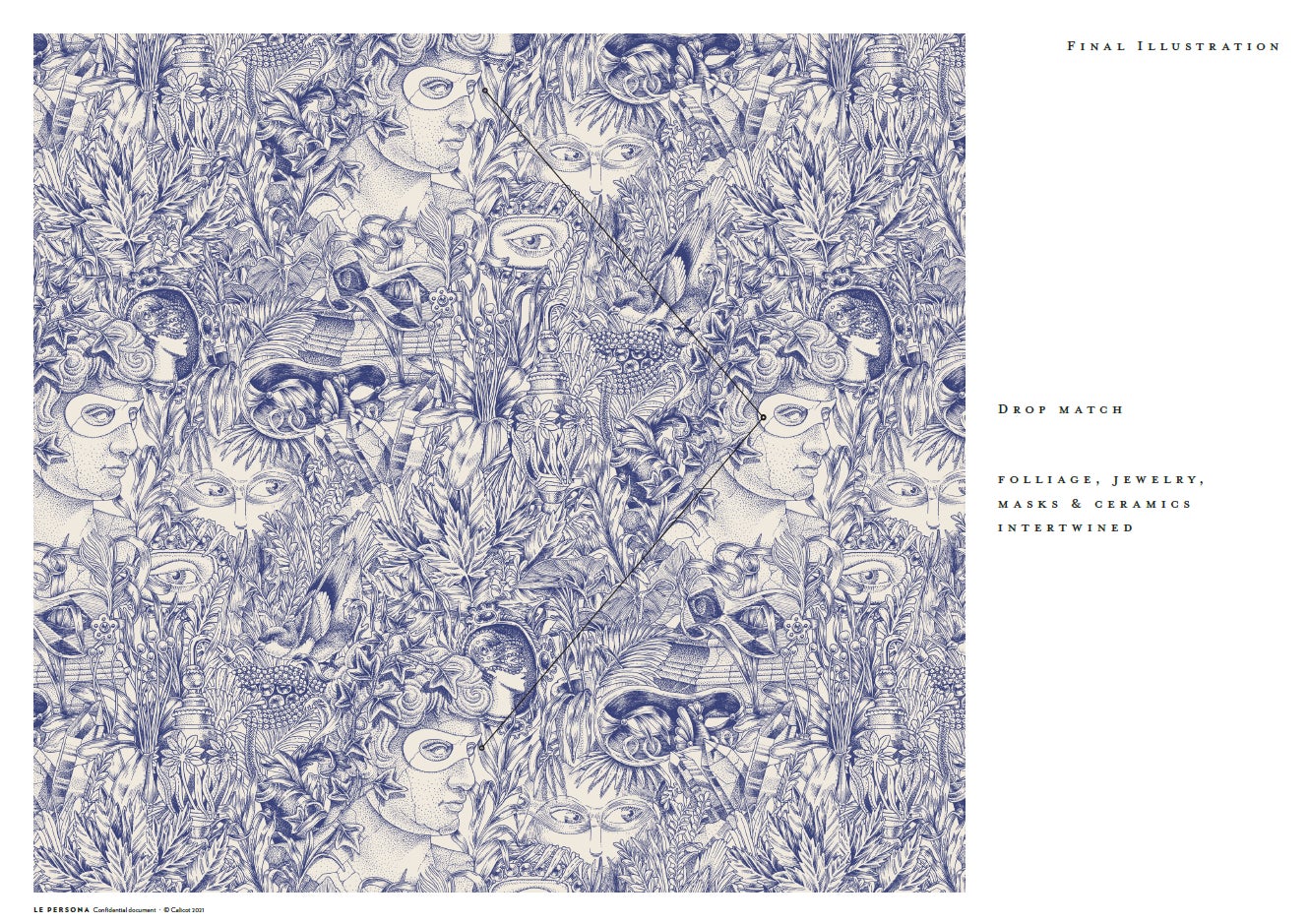 Calicot Paris社はルペルソナのブランドイメージである仮面と香りを象徴する様々なオブジェをパターン化したデザインを作りました。