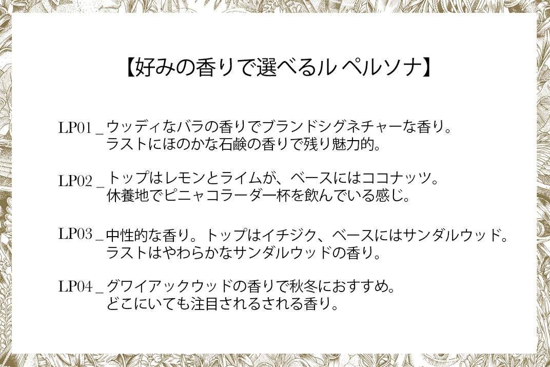 ル ペルソナの一番特徴であるパッケージイラストはCalicot Paris社とのコラボで誕生しました。Calicot Paris社はルペルソナのブランドイメージである仮面と香りを象徴する様々なオブジェをパターン化したデザインを作りました。Calicot Paris社はフランスアートディレクターでラストレイターとして活動しているAmandine DelaunayとRichard Helloによって設立され、Louis Vuitton,Moët Hennessyなどのグロバル企業と一緒に仕事をしています。