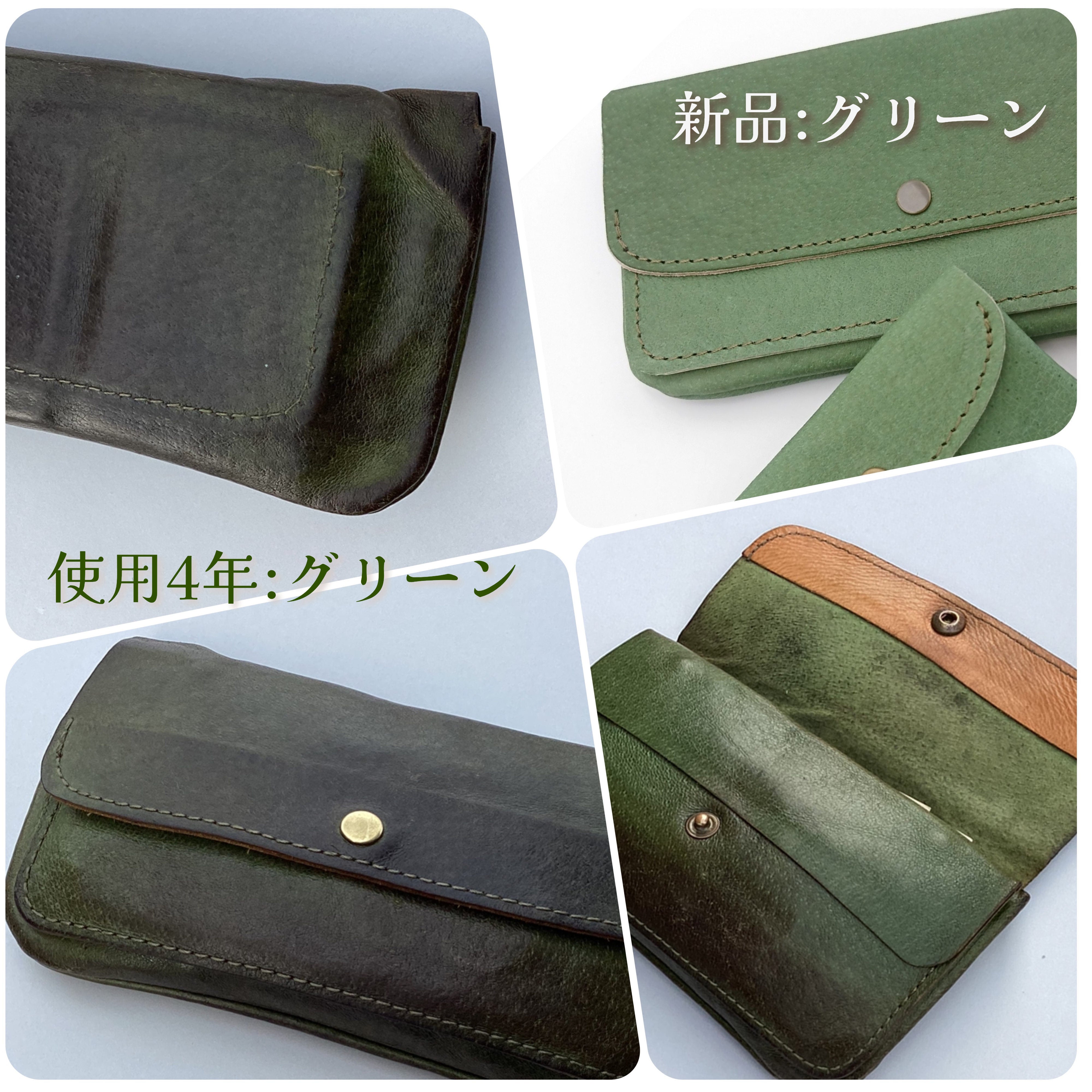 『レッド(赤)』、『ブルー(青)』、『グリーン(緑)』、『キャメル』は上記のもの中間的な印象です。色変化も楽しめますし、ナチュラルほどデリケートでもなく、扱いも楽です。十分、革らしさを楽しめる一品です。革好きの方でも、色物の革は使ったことがないという方も多いのでは?鮮やかな印象のお色も使っていくと、落ち着いた色に変わっていきます。ただ、革は染めものなので、全く一緒なお色の革と言うのは、存在しません。染めによって色のブレ幅が大きいのがこの4色です。写真の印象とは少し違った印象の物が届く可能性もございます。