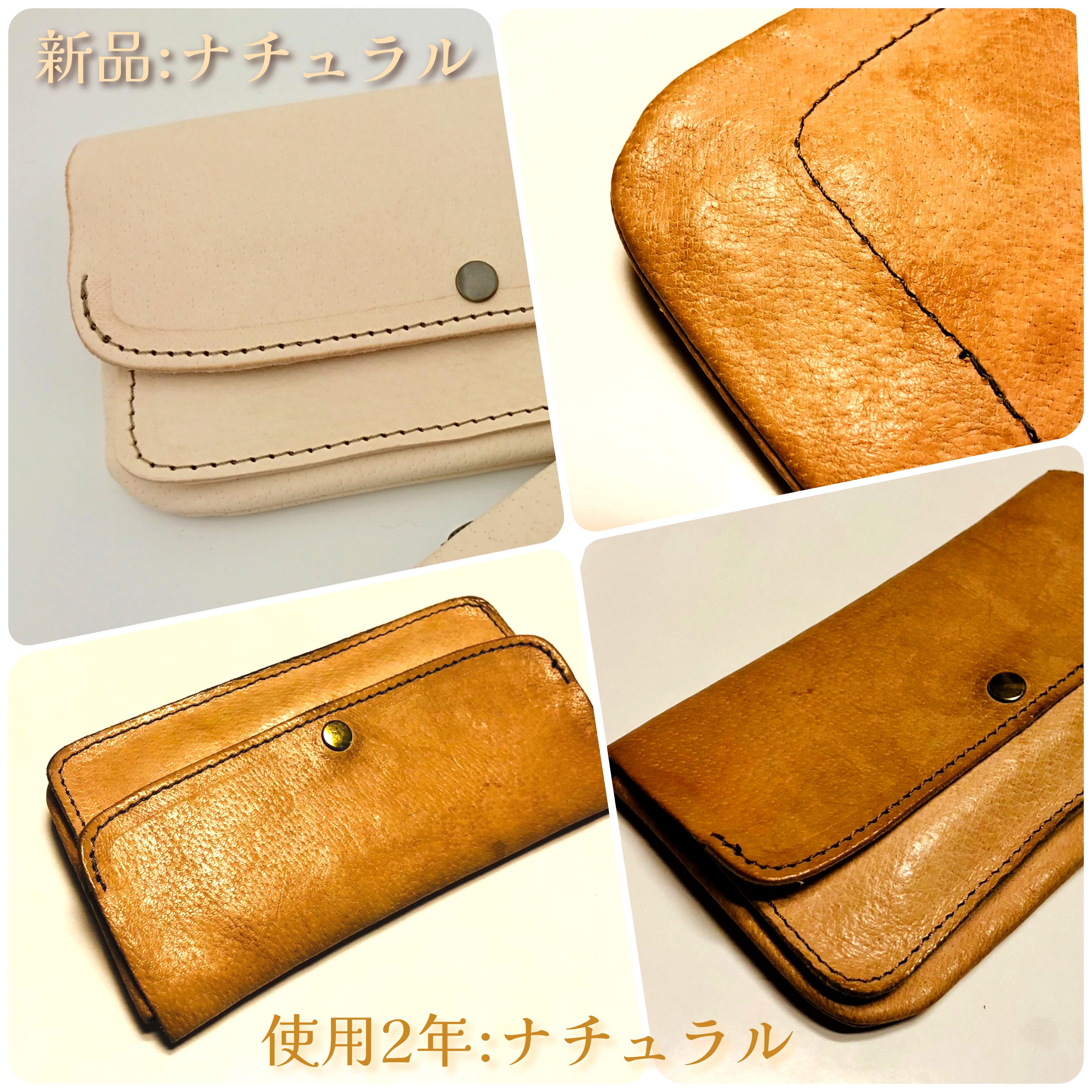 『ナチュラル』はもっとも色変化、経年変化を楽しめるお色となります。その分、デリケートなところもあり、汚れも目立ちやすく、シミ等もつきやすいです。長く使っていくことで、人の油が革に移り、シミもつきにくくなりますが、新品の時は扱いに注意が必要です。