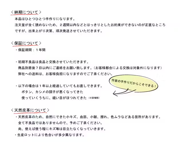 雨などによって濡れるとシミになりやすく、汚れも目立ちます。扱いに工夫、慣れが必要なカラーがナチュラルです。そのことをご理解頂いた上で、ご注文いただければと思います。素朴な革を育てるのが好きな方、どちらかというと革の扱いになれている革上級者さん向けになります。