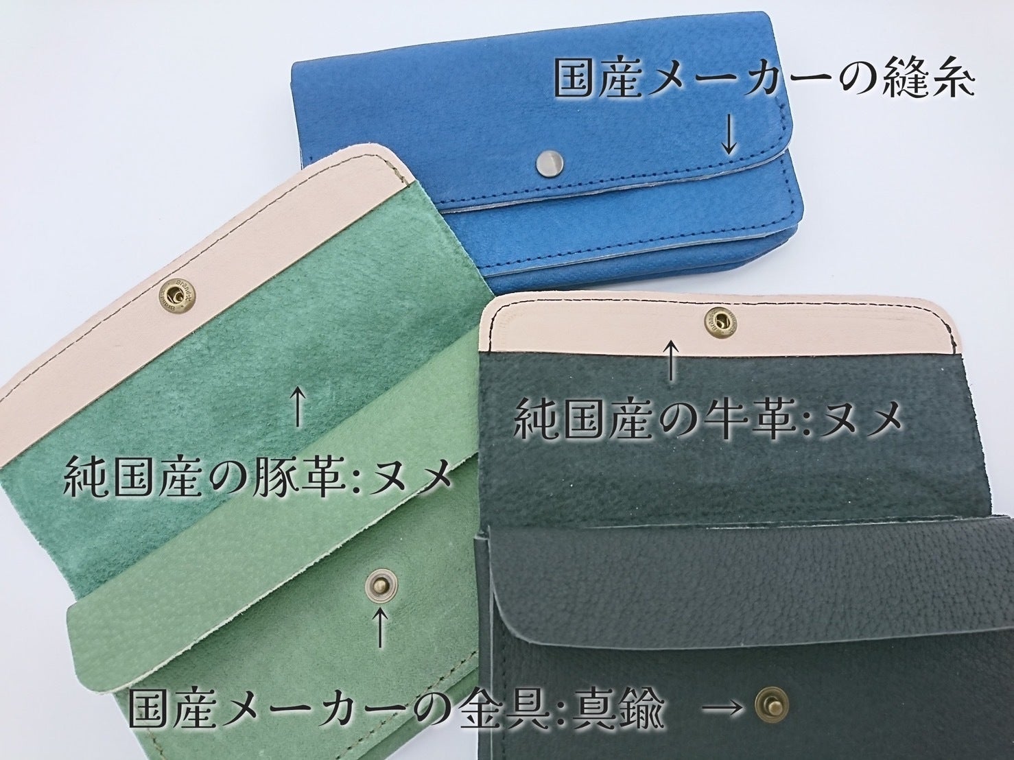 めざせ純国産!革はもちろん、小さなパーツまですべてこだわりました。日本で流通している革の多くは外国産となっております。国内メーカーの革ですら、原皮は海外のものというのは非常に多いです。今回使用している豚革は国内消費された、純国内産のものとなります。金具やパーツもすべて国内メーカーのものを使用しております。