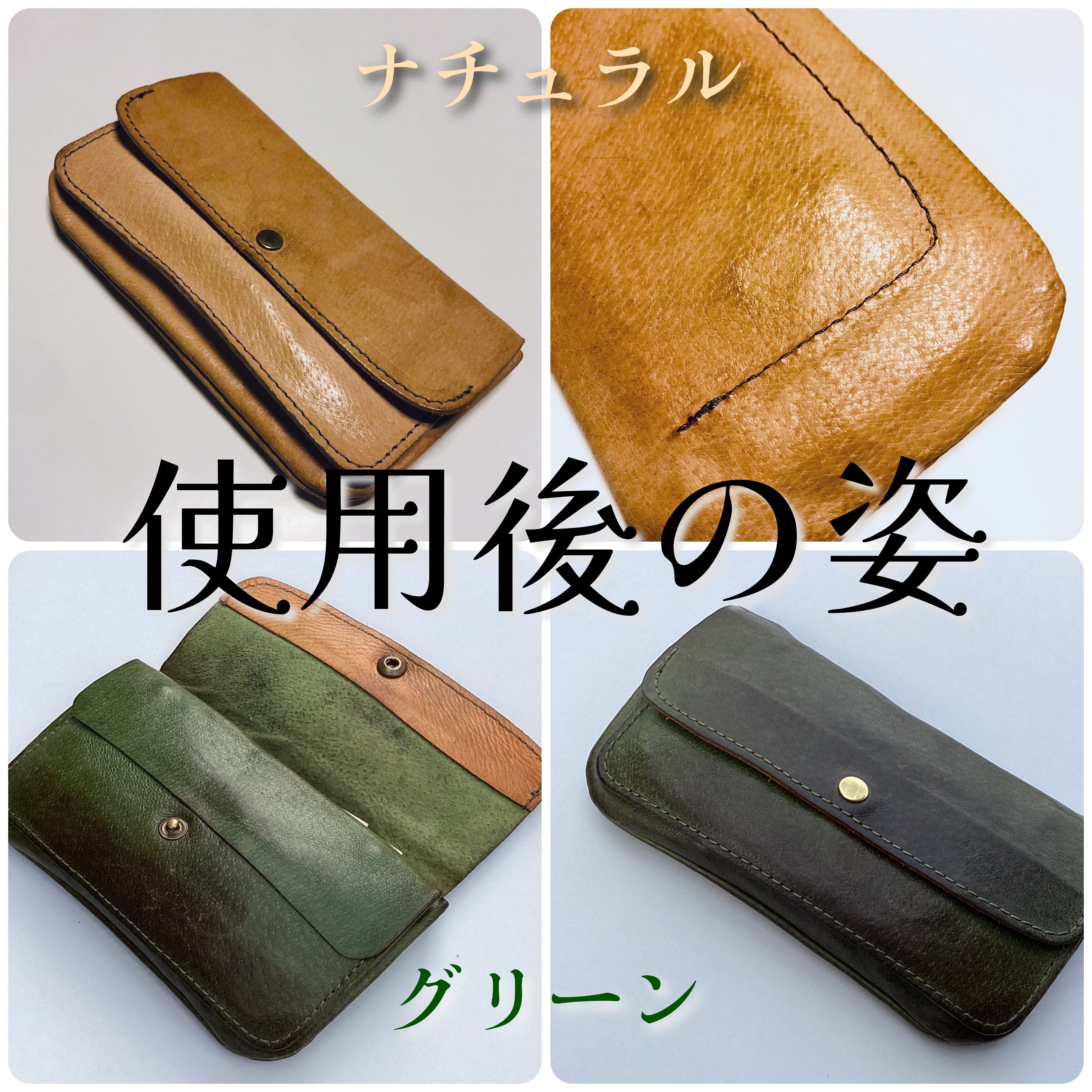 『レッド(赤)』、『ブルー(青)』、『グリーン(緑)』、『キャメル』は上記のもの中間的な印象です。色変化も楽しめますし、ナチュラルほどデリケートでもなく、扱いも楽です。十分、革らしさを楽しめる一品です。革好きの方でも、色物の革は使ったことがないという方も多いのでは?鮮やかな印象のお色も使っていくと、落ち着いた色に変わっていきます。ただ、革は染めものなので、全く一緒なお色の革と言うのは、存在しません。染めによって色のブレ幅が大きいのがこの4色です。写真の印象とは少し違った印象の物が届く可能性もございます。