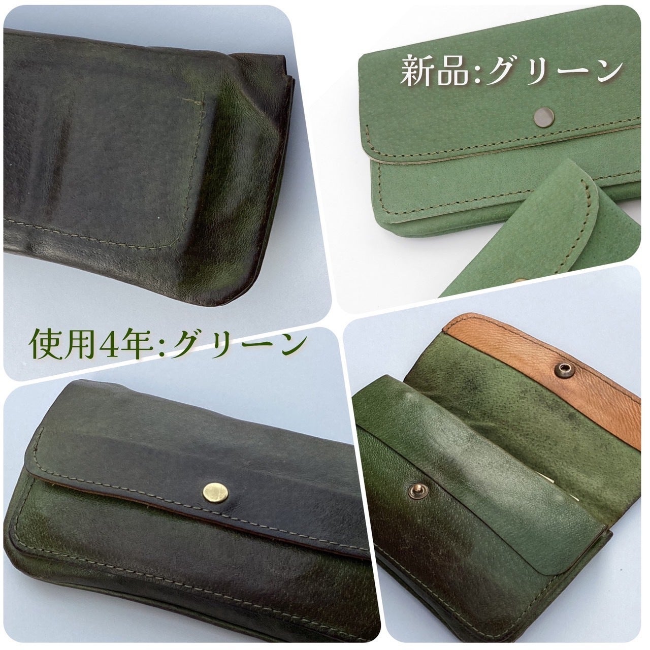 経年変化と一言で言ってもなかなか伝わらないかもしれませんが、具体的に言うと、使い込んだ時間と共に革が柔らかくなり色艶が増してきます。使う人によって、変化の具合は異なり、自分で革製品を育てていく喜びがあります。