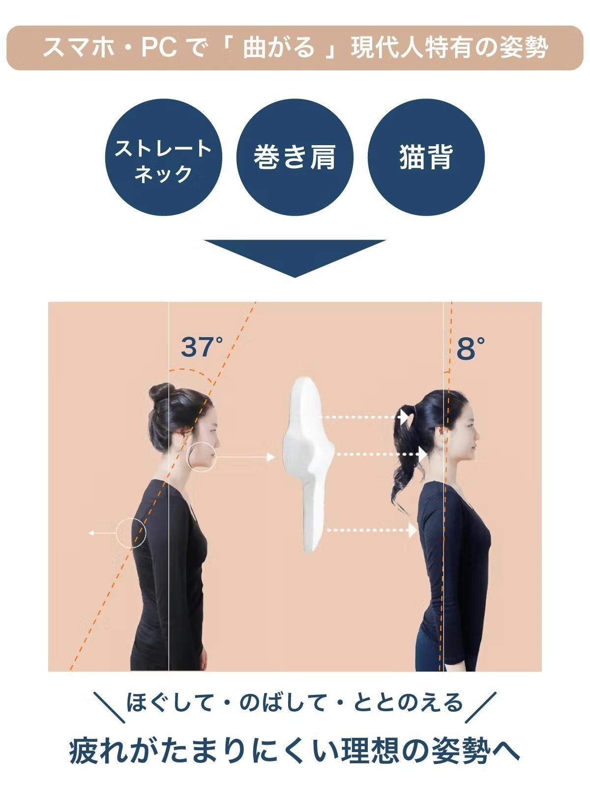 毎日のPC・スマホ姿勢は、首・肩・背中の緊張を引き起こしますが、ほとんどの枕が首のケアにしか焦点を当てていません。