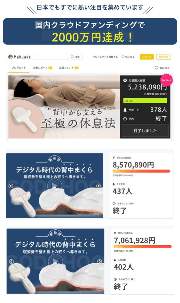 2024/06/08 15:00ご支援者様へこんにちは!ゴッチョ背まくらプロジェクトの岩上です。昨日より順次発送を開始しております。まだ商品が届いていらっしゃらないご支援者さま、到着までもう少々お待ちくださいますようお願いいたします。では早速ですが、2日目の使用方法についてお伝えさせていただきます。昨日、初日の使用時間は「1日10分まで」とお伝えしましたが、もうご使用いただいた方いかがでしたでしょうか?もし、昨日10分の使用で不快な刺激や違和感を感じた方は、今日も使用は10分以内に留めておいて下さい。しかし、今日は6時間以上の時間を置く事が出来れば、2度使用にチャレンジしていただけたらと思います。(例:15時に10分、21時に10分)私も、最初の数日間は15分くらい使用するとだるくなる感覚が続きました...。この状態は、あまり気持ちの良いものではないのですが、辛抱して少しづつ慣らしてみてください。これから体が慣れていくに従って、不快感や違和感は少しずつ軽減して快適さが増していきます。ゴッチョ背まくらの独特の感覚に「ハマる」まで、身体が変化していく過程も是非楽しんでいただけたらと思います。逆に、不快感や違和感を感じなかったという方は、今日は使用時間を15〜20分ぐらいに伸ばしてみて下さい。こちらも、6時間以上の時間を置く事が出来れば、本日は2度使用にチャレンジしていただけたらと思います。実はすぐに身体に適応して、数日後には長時間使用ができるようになる方もいらっしゃいます。ゴッチョ背まくらの適応期間は個人差が大きいため、ご自身の体と相談しながら無理をしない範囲で使用時間の調整をしてみてください。今日は併せて、ゴッチョ背まくらを使用する“時間帯”についてもお伝えしたいと思います。主婦の方や、テレワークの方、長時間の勉強をされる学生さんなど、ご自宅で日中をお過ごしの方は、休憩中や隙間時間の10分~15分横になる時間を毎日の習慣にしてもらえたらと思います。忙しいと、「自分のための10分」は後回しにしがちだと思いますが、5分でもいいので使用する時間を作ることを習慣にしてもらえたら、疲労のたまり具合とかが変わってくると思いますので、是非習慣化にチャレンジしてみてください。あと、お風呂上りの使用もオススメです。入浴によって筋肉の緊張がゆるんで柔らかくなっているので、違和感を感じにくくなります。身体がガチガチの緊張状態を維持している時は何もしていなくても疲労感を感じます。入浴で筋肉をリラックスさせたあとに、さらにリラックスできる「ゴッチョ時間」を設けてあげるとより効果的です。そして、入眠前のご使用もオススメです。眠る前に、固まった筋肉を伸ばして身体を整えることで、心身ともにリラックスした状態で入眠出来たら、睡眠の質も変わります。睡眠は、最初の90分が一番深く眠りにつくので、緊張を開放して入眠することは質の良い睡眠に繋がるのです。どのタイミングでも「ゴッチョ背まくら」をご使用の際は、ゆっくりと大きく呼吸をすることがポイントになります。こちらについては、長くなってしまったので明日の「3日目の使い方」でまた、詳しくお伝えできたらと思います。今日も長くなってしまいすみません。。。ここまで目を通していただきありがとうございます!それでは、2日目も無理せずにゴッチョ背まくらの独特の使用感を、お楽しみいただけたら幸いです。本日もありがとうございました!引き続きよろしくお願いいたします! もっと見る