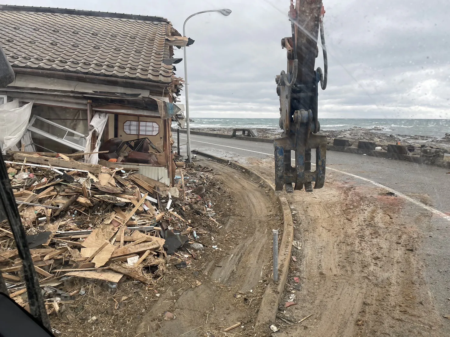 海岸沿いの民宿が崩れて道を一斜線通れなくなっているので、