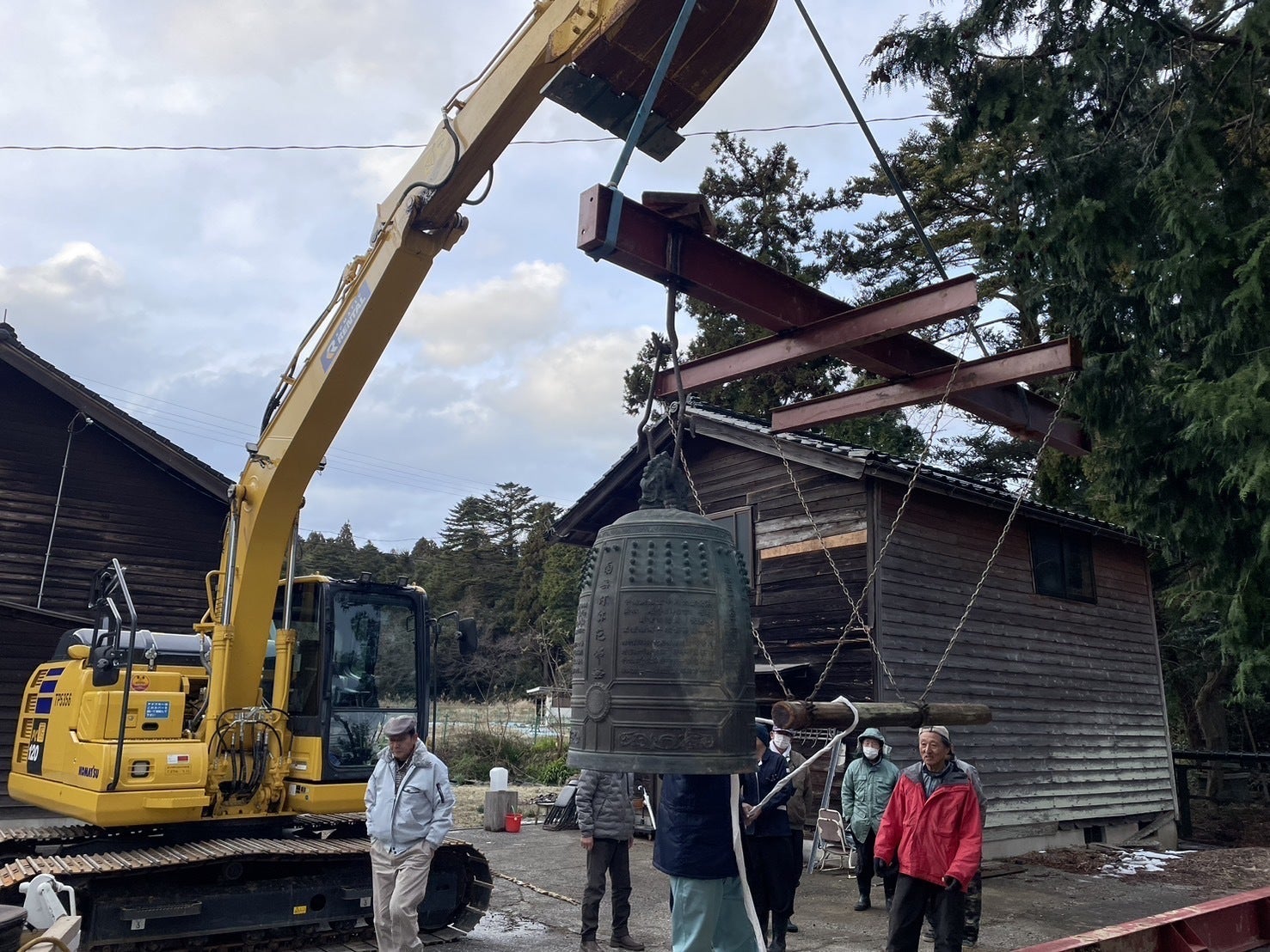 そしてついに年の瀬。須須神社の鐘を重機で吊っていると写真が舞い込みました。なんと除夜に鳴らす鐘まで釣って(吊って)いたのです。