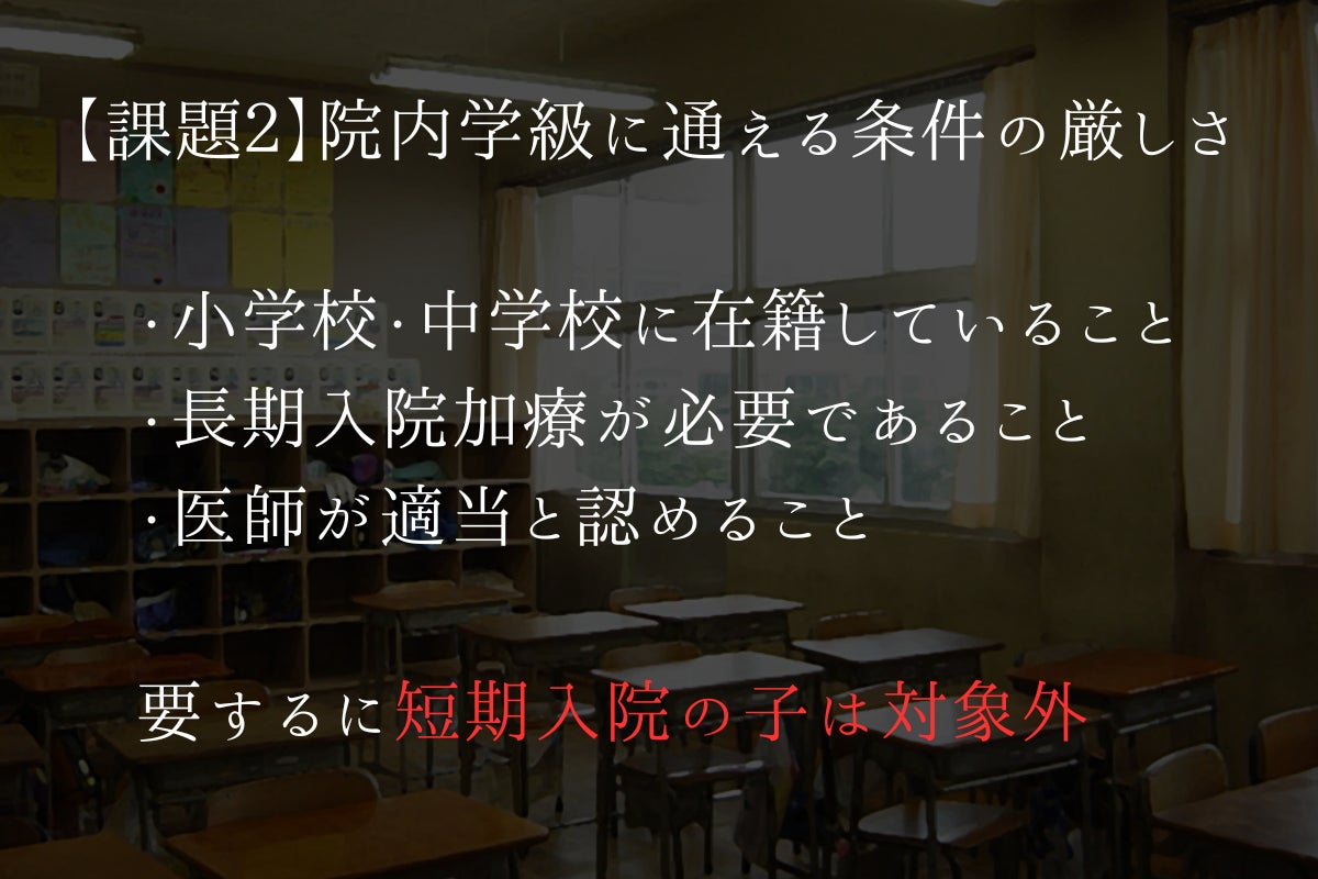 一見してみると簡単にクリアできそうな条件ばかりに見えます。しかしながら、二つ目の条件にある「長期入院加療(1か月から6か月程度)を必要とすること」を満たすのが大変難しく、多くの子どもたちがこの条件によって院内学級に通えない状況となっています。