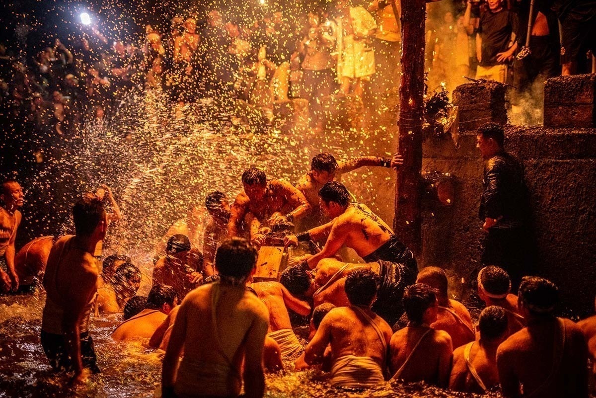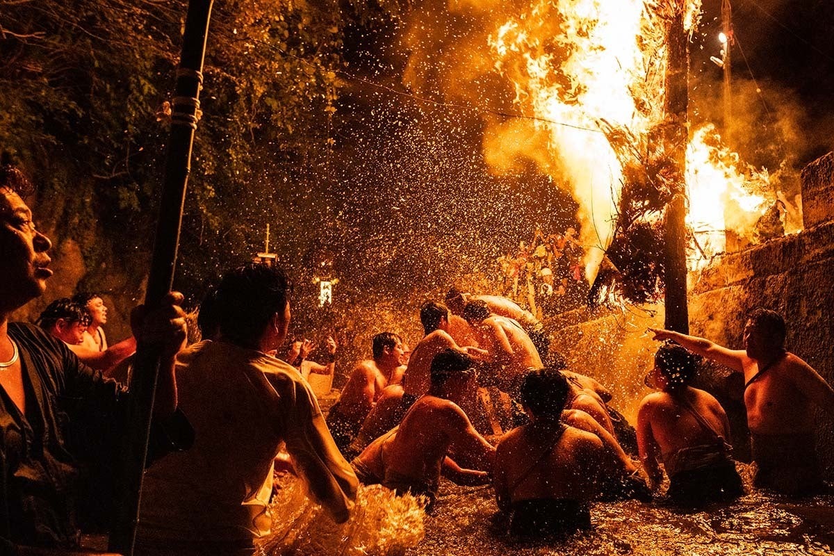 川の中では大松明の下で火の粉を浴びながら暴れます