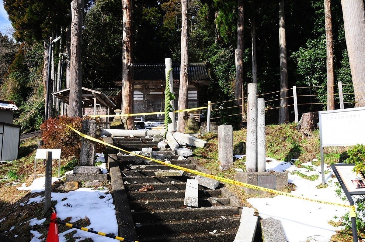 かつての白山神社の鳥居(左写真)と能登半島地震後の様子(右写真)